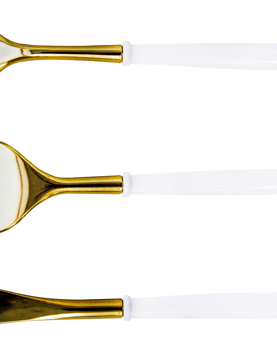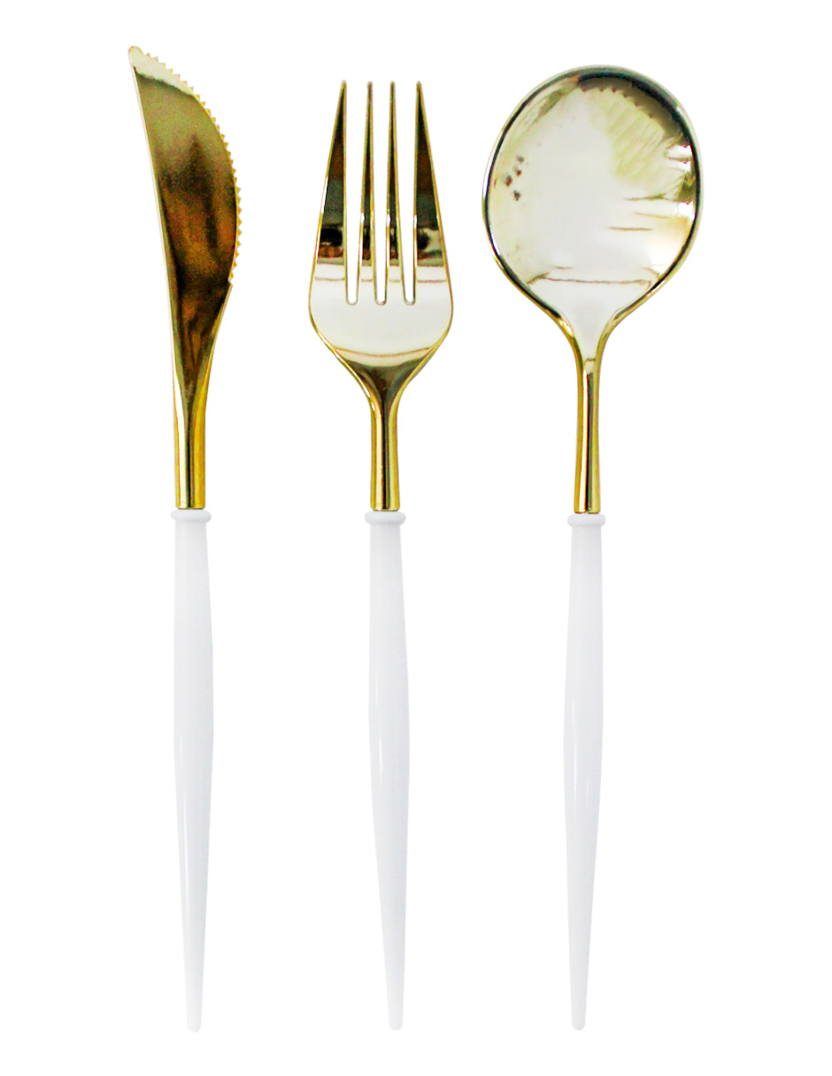 Juego de 12 cubiertos de plástico blancos con dorado cuchara/cuchillo/tenedor de 11x26x2.5cm