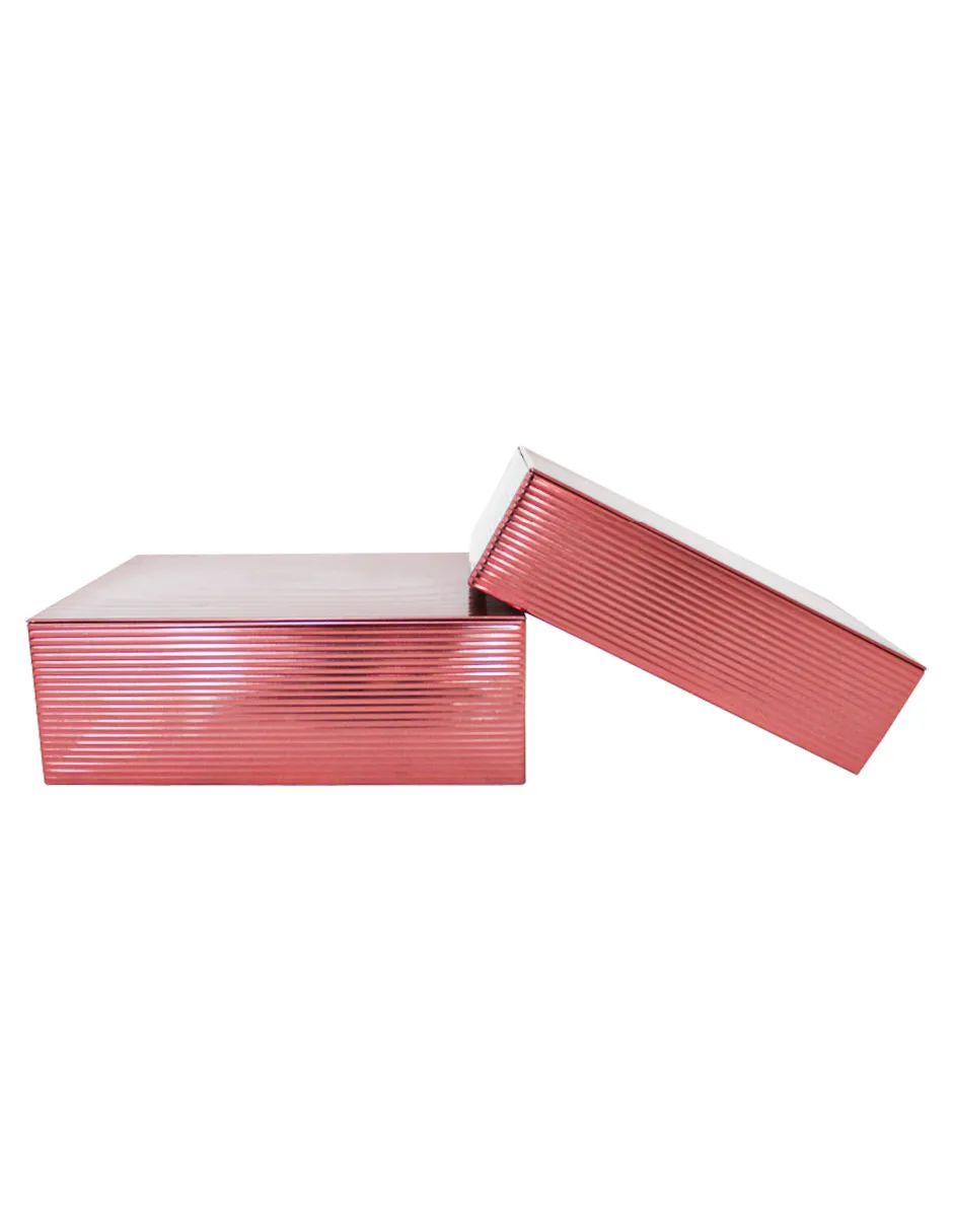 Dale un toque de elegancia a tu hogar. Este juego de 2 cajas rectangulares de lámina a rayas color vino es perfecto para guardar tus objetos. Su diseño te hará sentir la organización y la distinción. Mide 17/6.4×24/22×8.8×6.4cm.