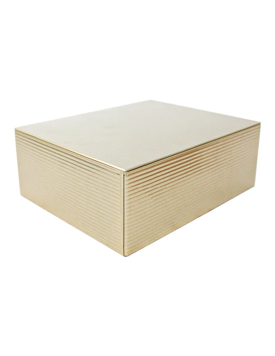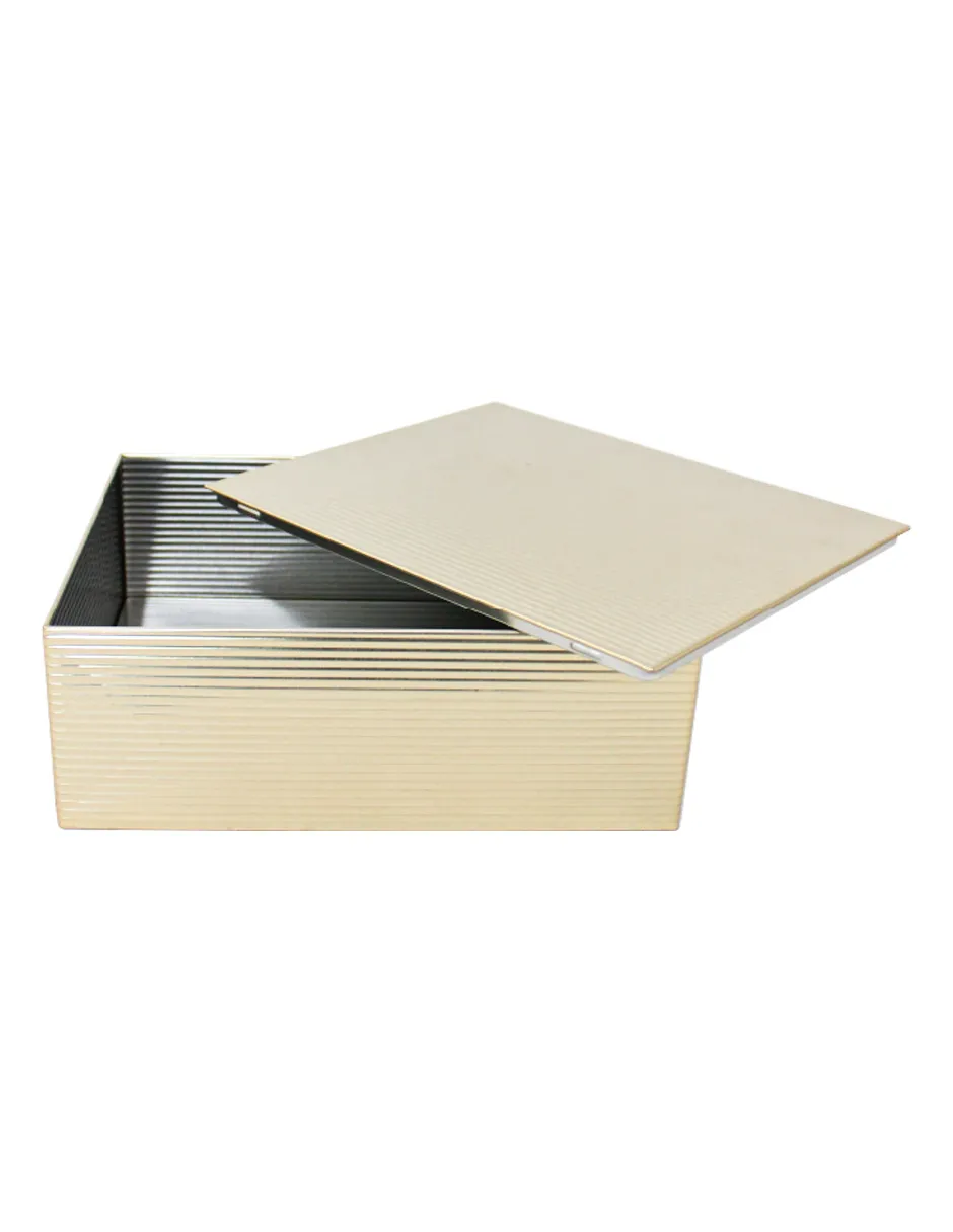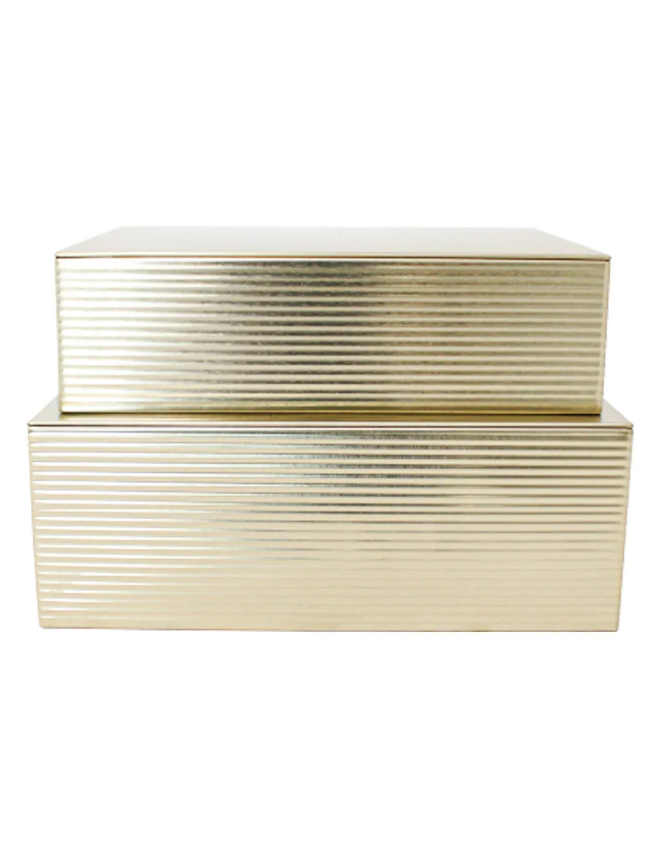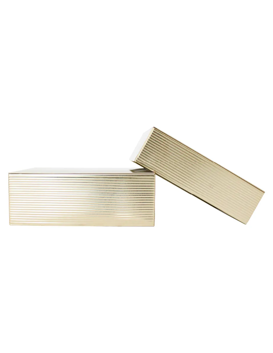 Dale un toque de elegancia a tu hogar. Este juego de 2 cajas rectangulares de lámina a rayas dorada es perfecto para guardar tus objetos. Su diseño te hará sentir la organización y la distinción. Mide 17/6.4×24/22×8.8×6.4cm.