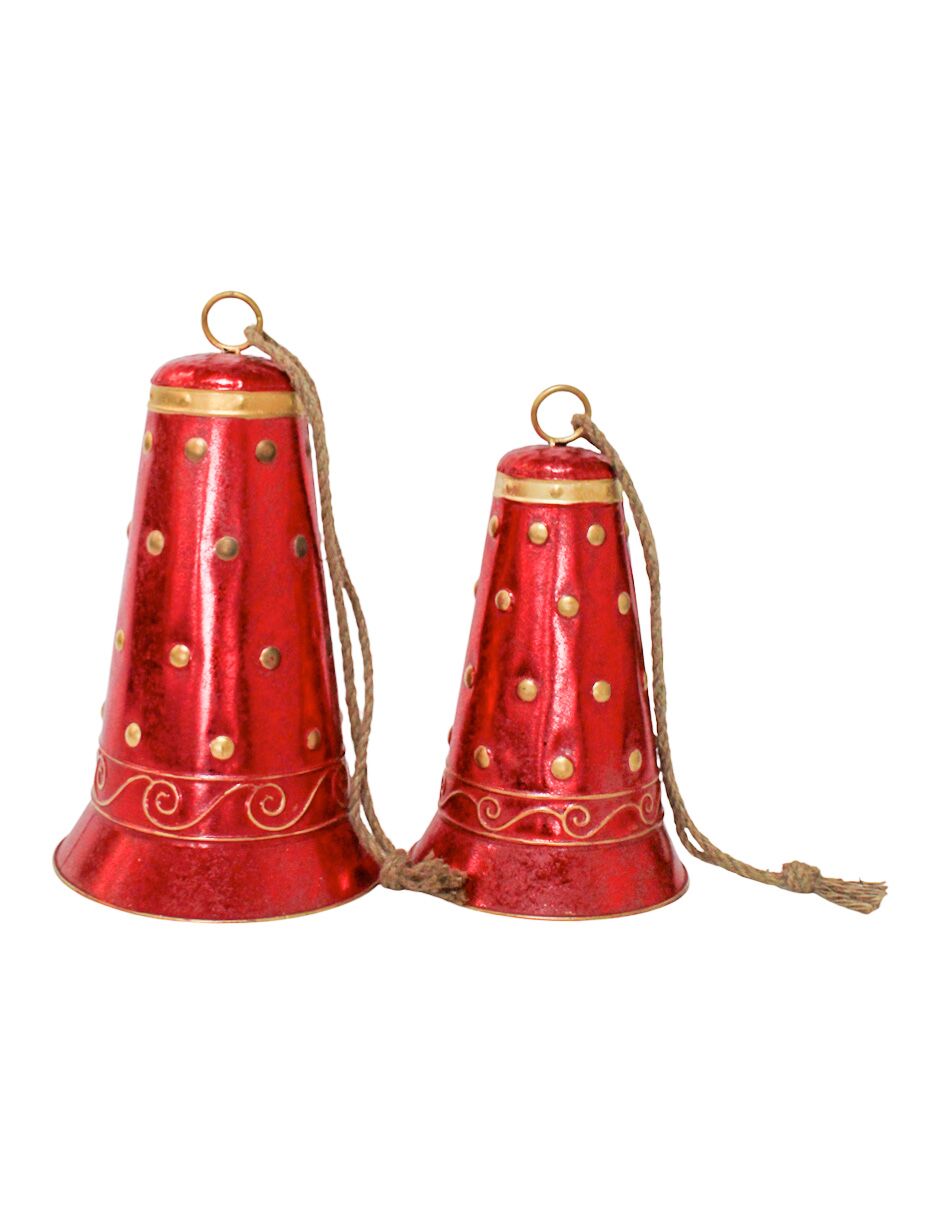 Juego de 2 campanas colgantes en un festivo color rojo con detalles dorados. Esta pieza es perfecta para quienes buscan una decoración clásica y atemporal. Su diseño evoca una sensación de tradición y sofisticación, perfecta para crear un ambiente elegante y festivo que llenará tu hogar de un encanto inolvidable. Material: metal. Medidas: 26x26x43.2 /21.6×21.6×36.8cm.