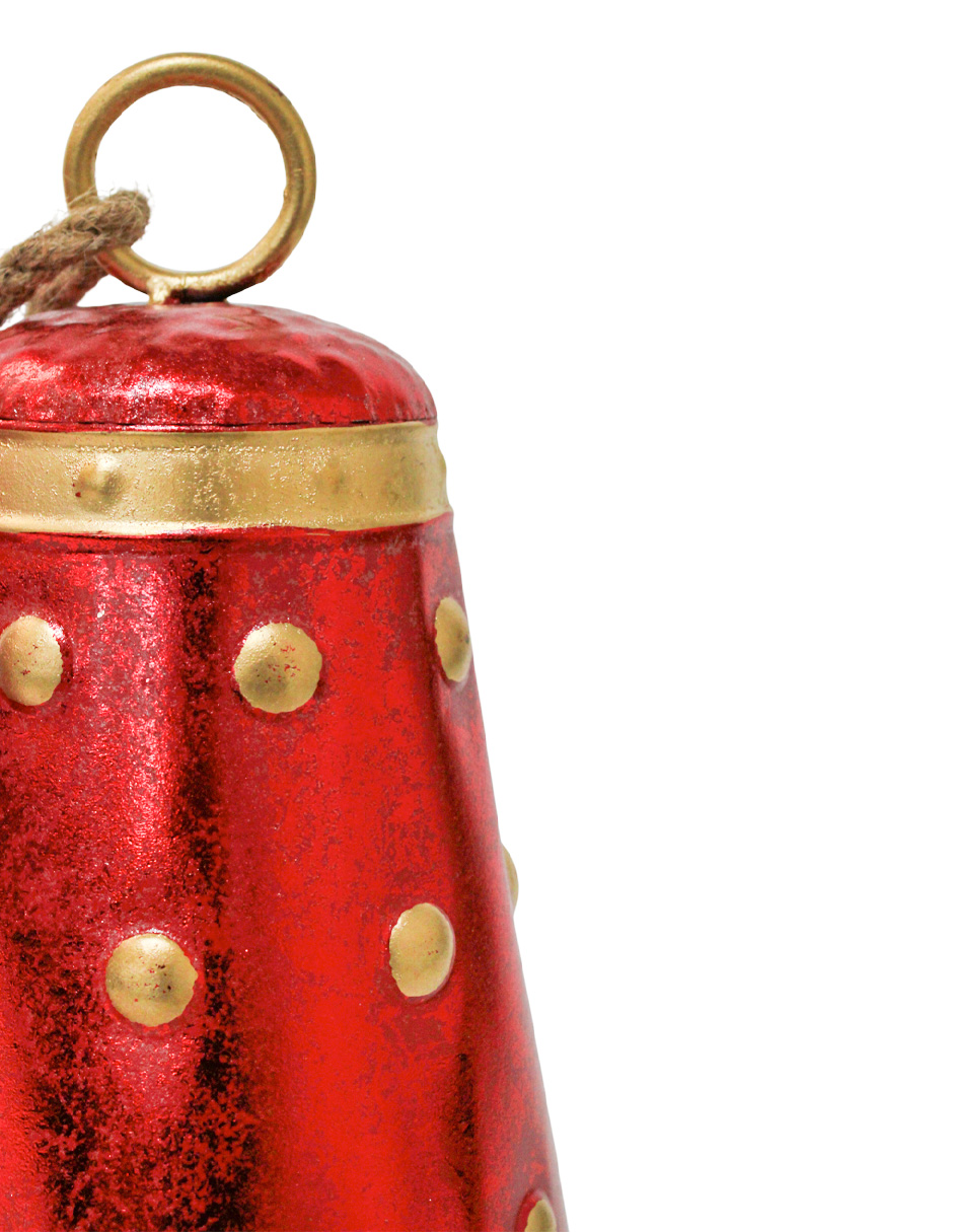Juego de 2 campanas colgantes en un festivo color rojo con detalles dorados. Esta pieza es perfecta para quienes buscan una decoración clásica y atemporal. Su diseño evoca una sensación de tradición y sofisticación, perfecta para crear un ambiente elegante y festivo que llenará tu hogar de un encanto inolvidable. Material: metal. Medidas: 26x26x43.2 /21.6×21.6×36.8cm.