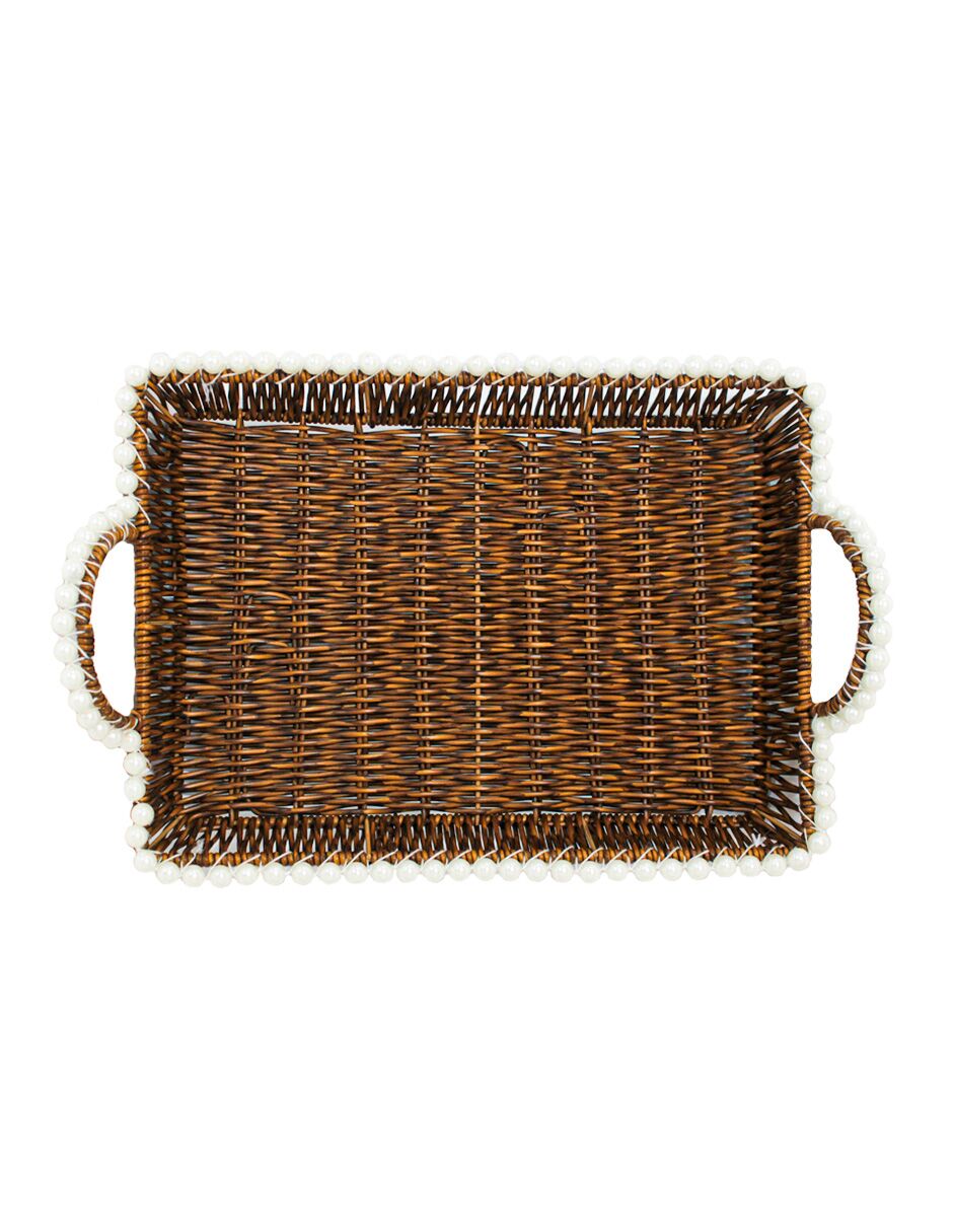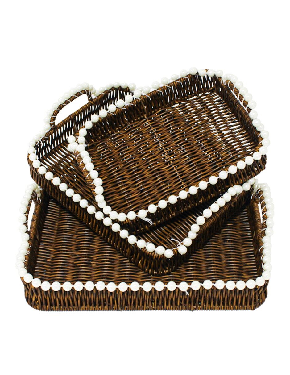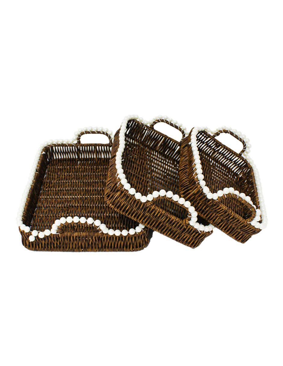 Juego de 3 cestas de plástico café rectangular con perlas en las orillas de 32×25.5x5cm/27.5×21.5x8c