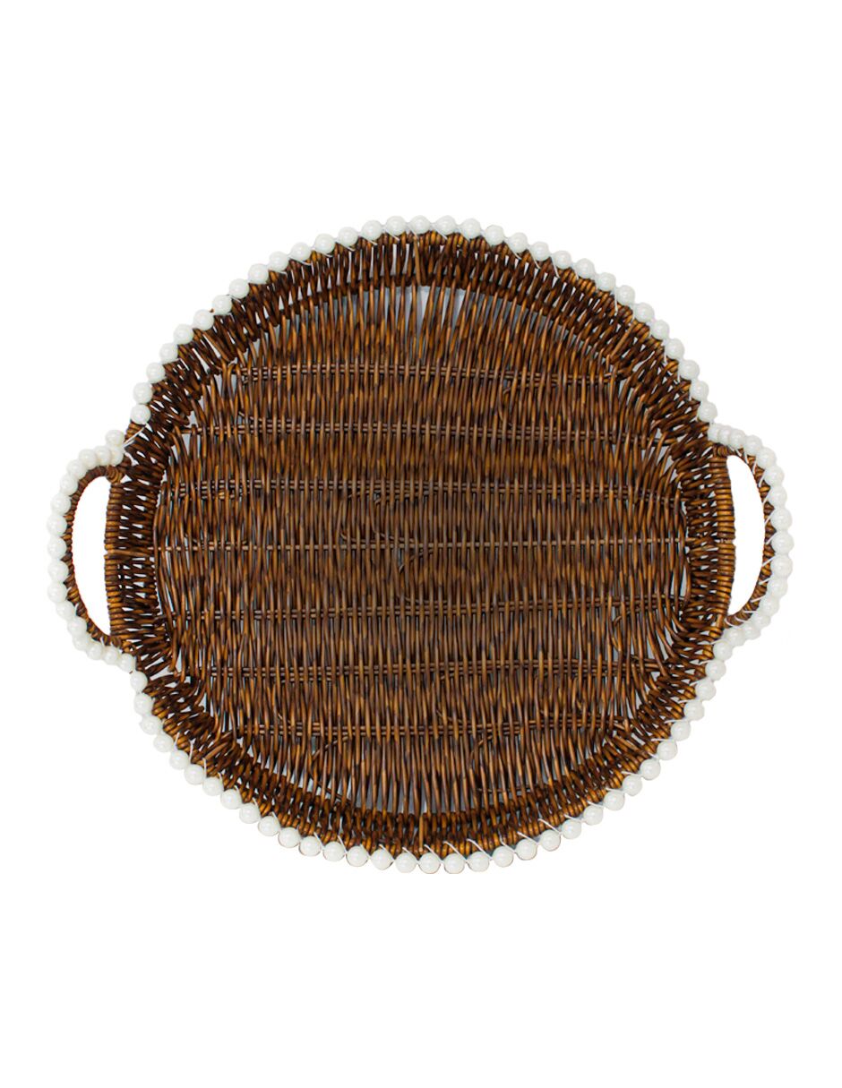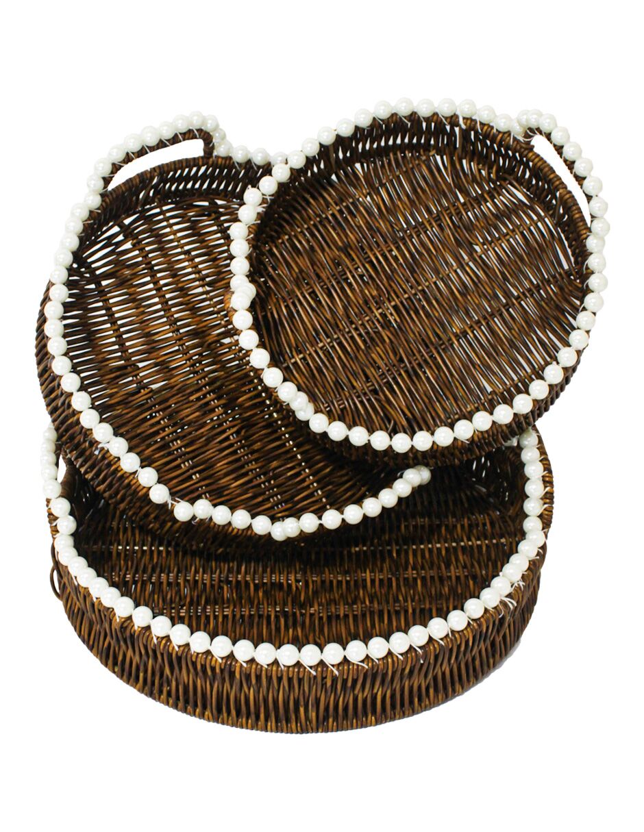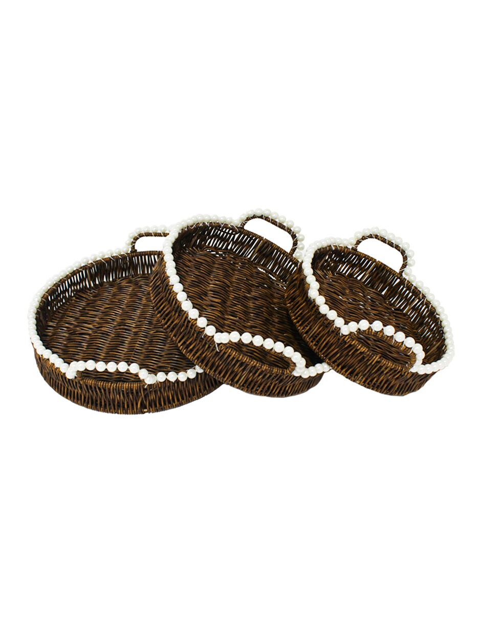 Juego de 3 cestas de plástico café redondas con perlas en las orillas de 30x1x5cm/26x1x8cm/22x1x9cm