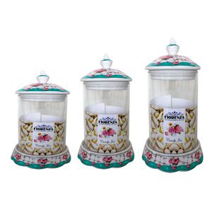 Juego de 3 frascos de vidrio con base y tapa de porcelana floreada