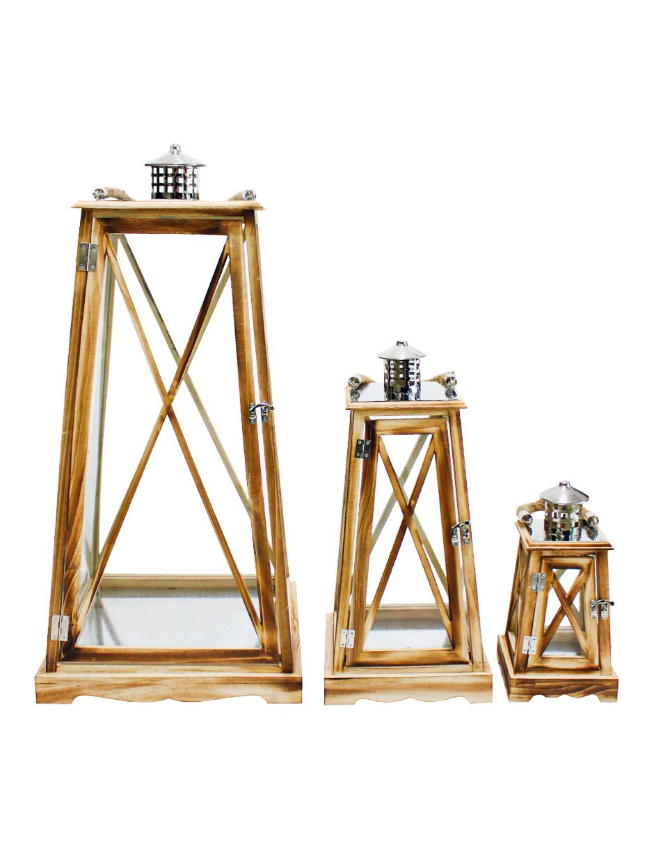 Juego de 3 linternas de madera natural con vidrio de 34.5x24x72cm
