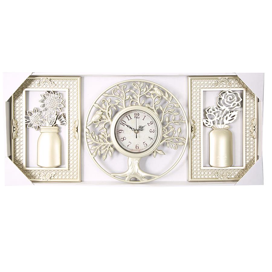 Este set de reloj de 71.5x4x30.5cm es una pieza funcional y decorativa que evoca la conexión con la naturaleza y la vida. El reloj central tiene un diseño de Árbol de la Vida con un acabado metálico de color champagne, flanqueado por dos paneles decorativos con flores en jarrones, que complementan su estilo. Es el accesorio perfecto para añadir un toque de sofisticación y armonía a tu sala, estudio o entrada, ideal para quienes buscan una decoración con significado.