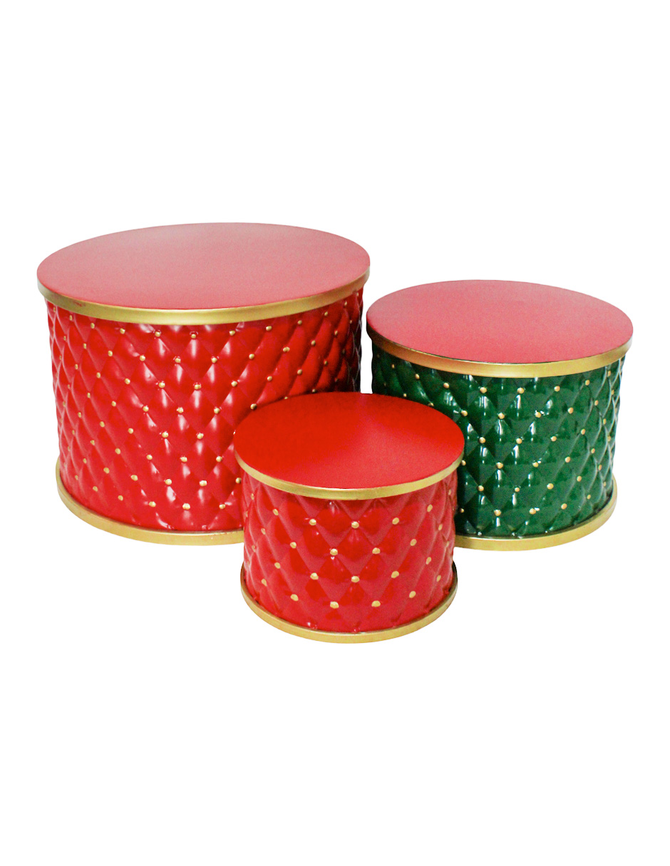 Un toque de magia y fantasía para la temporada. Este juego de 3 tambores de metal con diseño capitonado en colores rojo y verde y orilla dorada es la pieza perfecta para decorar tu hogar en la temporada festiva. Su diseño lleno de detalles evoca alegría y calidez.