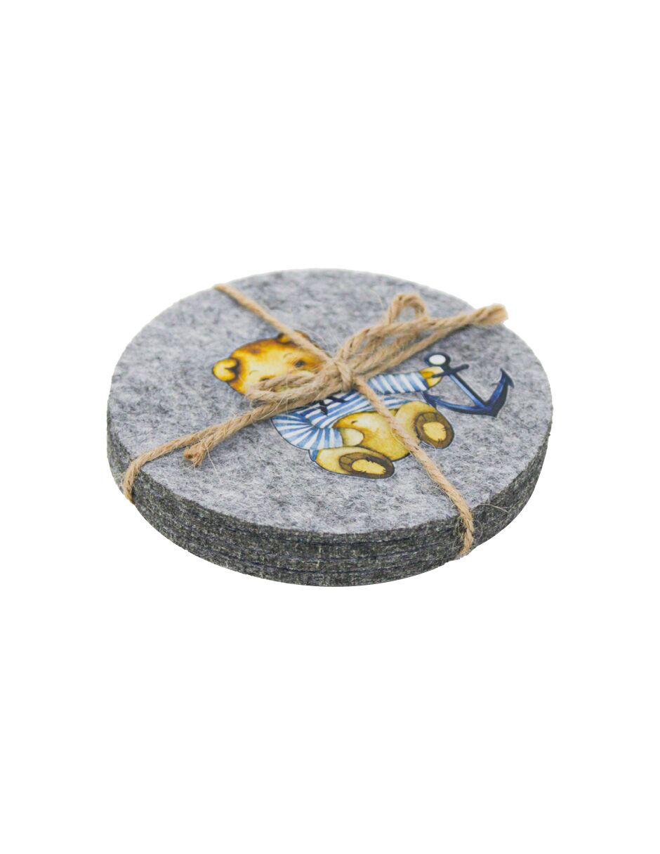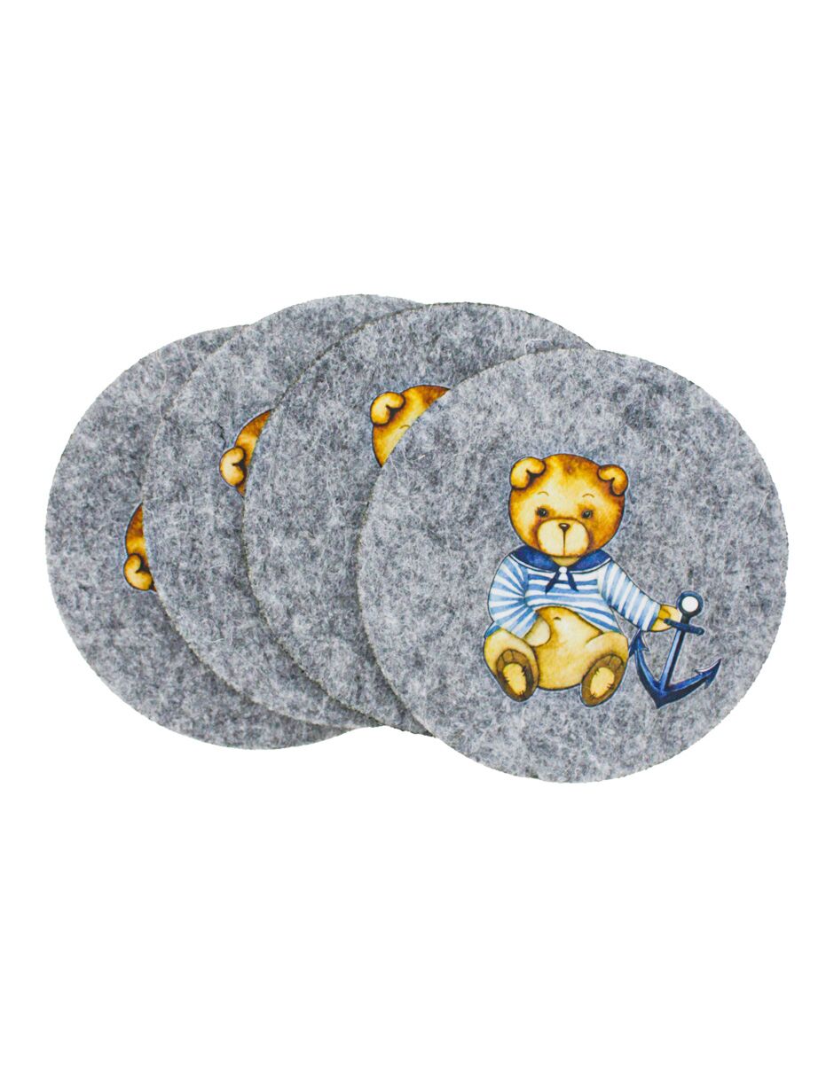 Un toque divertido y adorable para tu espacio. Este set de 4 porta vasos de fieltro con diseño de osito marino es el accesorio perfecto para añadir un aire divertido a cualquier habitación. Con un diseño que combina una superficie gris de fieltro y un estampado de osito marinero con un ancla, estos posavasos crean un ambiente ideal para proteger tus superficies, y sorprenderán a todos con su belleza, durabilidad y funcionalidad. Cuidado y Limpieza: