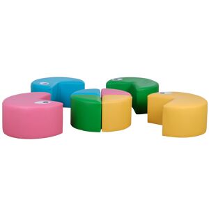 Divertido set de 4 asientos modulares infantiles con forma de rebanadas circulares abiertas. Compuesto por varias piezas de polifoam con cubierta de vinipiel, son ligeros y seguros. Las piezas se pueden usar individualmente como taburetes o unirse para crear un asiento circular, ideal para áreas de juego con un diseño geométrico y divertido.