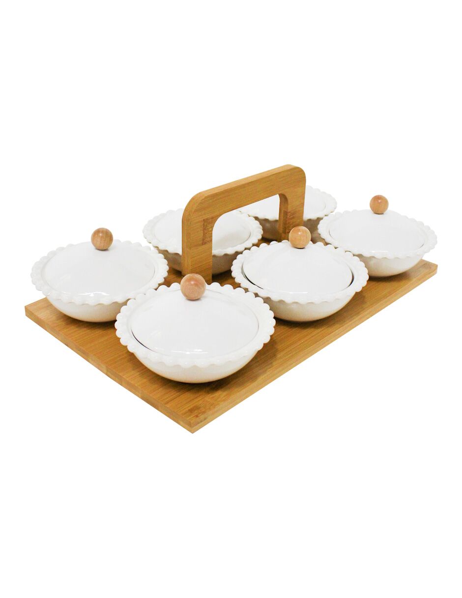 Un elegante juego de 6 botaneros de porcelana con tapa y orilla con diseño de perlas, en una base de madera. Este conjunto es perfecto para servir aperitivos, añadiendo un toque de sofisticación y elegancia a tus reuniones. Material: porcelana y madera. Medidas: 35.5 x 24 x 5cm.
