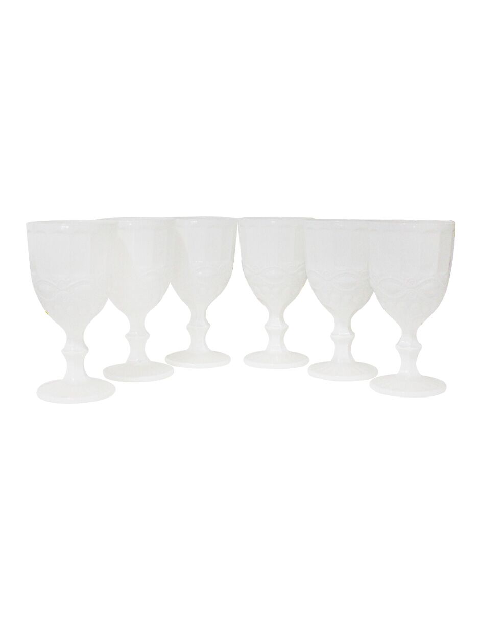 Set de copas que invita a la nostalgia con su encantador relieve de inspiración vintage y sus vibrante color blanco. Cada copa es una joya que añade alegría y personalidad a tu mesa. Son perfectas para servir agua, cocktails o jugos. El material es vidrio de alta calidad.