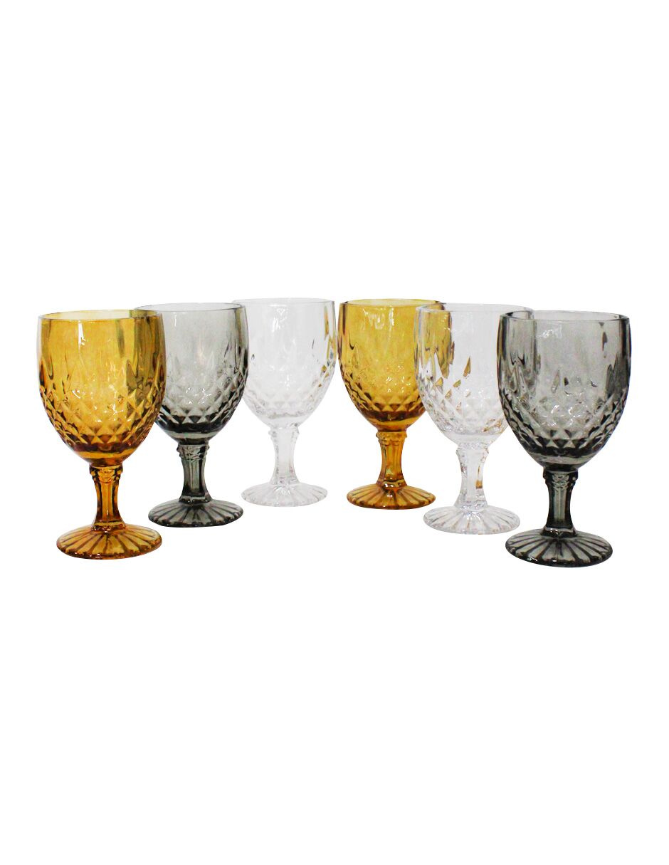 Juego de 6 copas de vidrio con diseño rombos en ámbar, negro y humo