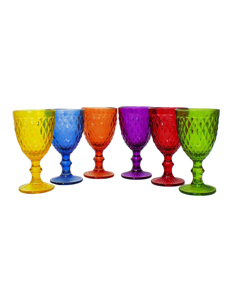JUEGO DE 6 COPAS DE VIDRIO DE COLORES CON FINOS BORDES. POTENCIAN SU FRESCURA CON CADA TONALIDAD. RELIEVE SUTIL DESDE LA BASE DEL CALIZ CON DISEÑO UNICO EN FORMA DE ROMBOS.DALE UN GIRO A TUS COMIDAS Y CENAS CON UN POP DE COLOR A TU MESA. ESTE JUEGO EXIGE UN CUIDADO ESPECIAL PARA CONSERVAR SU BELLEZA DURANTE MUCHO TIEMPO. SOLO DEBEN LAVARSE A MANO. LAVAR CON ESPONJA SUAVE Y EVITAR DETERGENTES ABRASIVOS. SECAR CON PAÑO SUAVE.