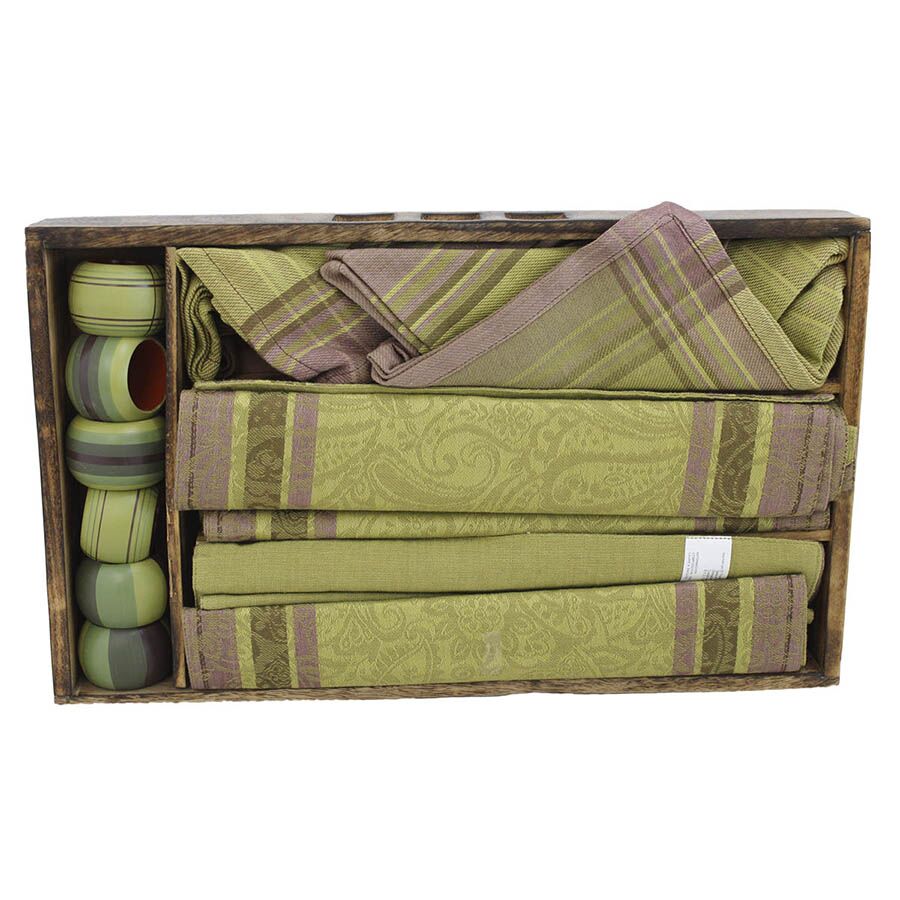 Juego de 6 manteles con servilletas yservilleteros verde con cafe y 1 charola de 33×48/40x40cm