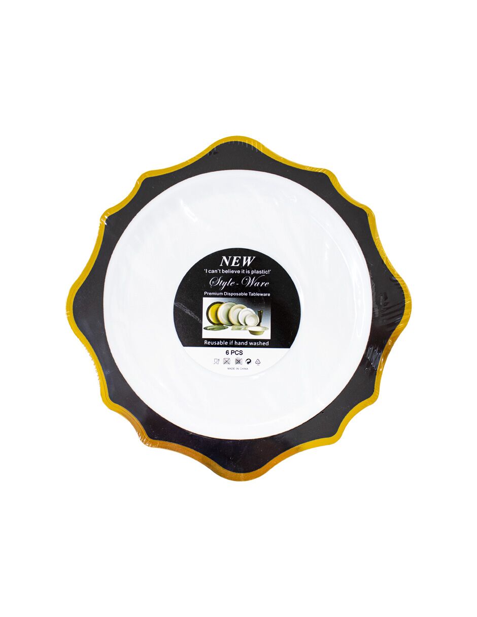 Juego de 6 platos blancos con orilla ondulada negra con dorado de plastico de 17cm