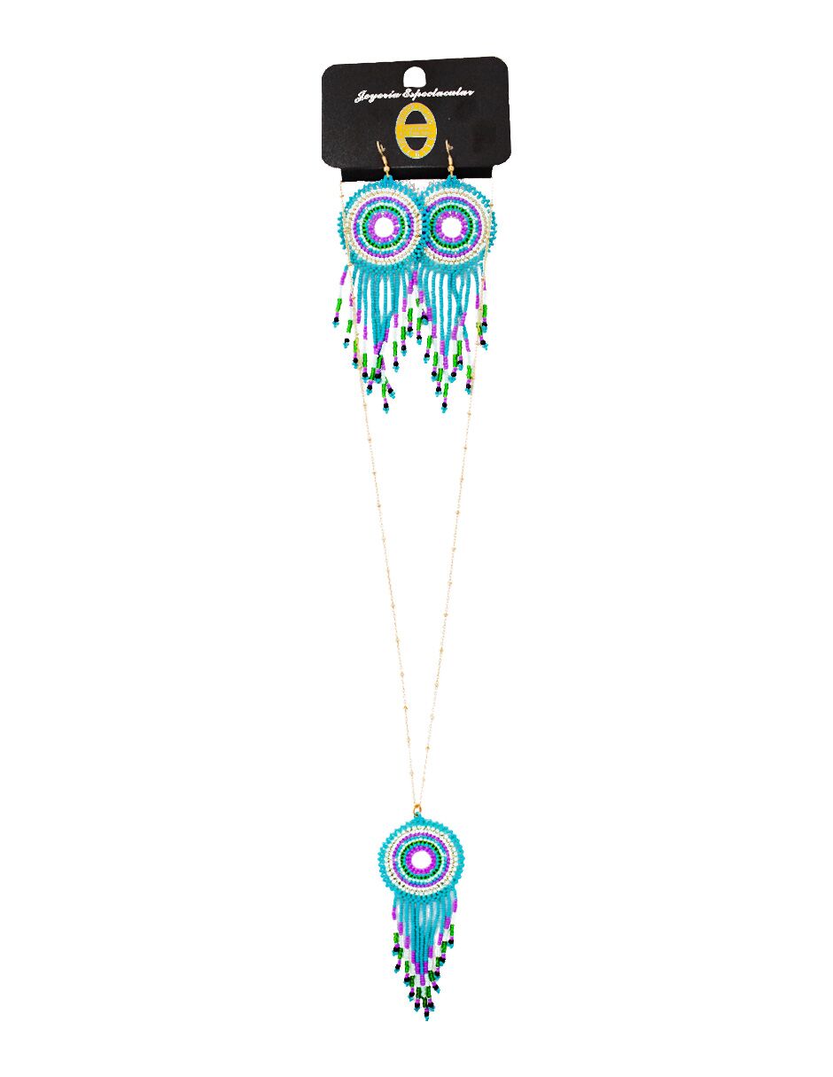 Juego de collar y aretes diseño chaquira azul de 13x72x1cm