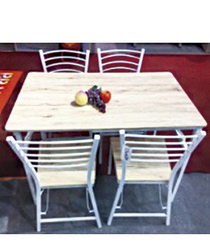 Juego de comedor familiar que incluye una mesa rectangular y 4 sillas con diseño robusto. Fabricado con acabados de imitación madera de uso diario sobre una estructura estable. El material es imitación madera y metal. Medidas: 110 x 70 x 74 cm / 41 x 49 x 86 cm.