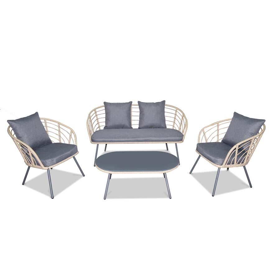 Este set de sala para exterior es una solución completa y moderna para decorar tu terraza, jardín o patio. El conjunto incluye un sofá, dos sillones individuales y una mesa de centro ovalada con una elegante cubierta. Cada pieza presenta un diseño de tejido de fibras plásticas en un tono claro sobre una estructura de metal, lo que garantiza durabilidad y resistencia a la intemperie. Los cojines grises brindan un toque de color y el confort necesario para tus momentos de relajación al aire libre.