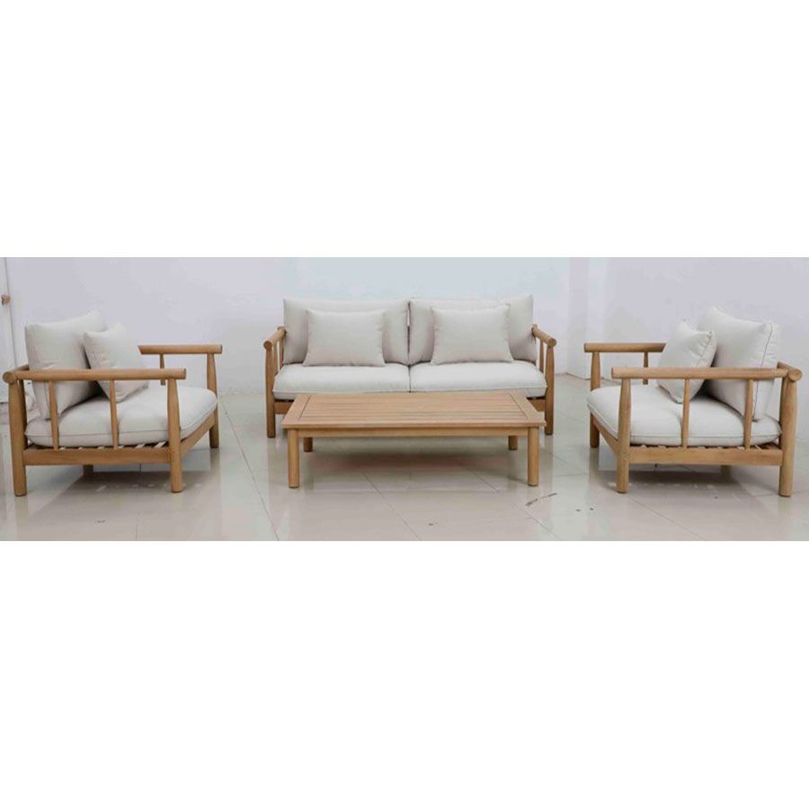 Este set de sofá es una pieza de mobiliario funcional y versátil que combina la calidez de la madera con un diseño moderno y minimalista. Su estructura de madera con líneas limpias y los cojines acolchados en un tono claro se adaptan perfectamente a cualquier ambiente, aportando una sensación de calma y confort. La simplicidad y elegancia de su estilo lo convierten en el complemento ideal para crear un espacio acogedor en tu sala o terraza.