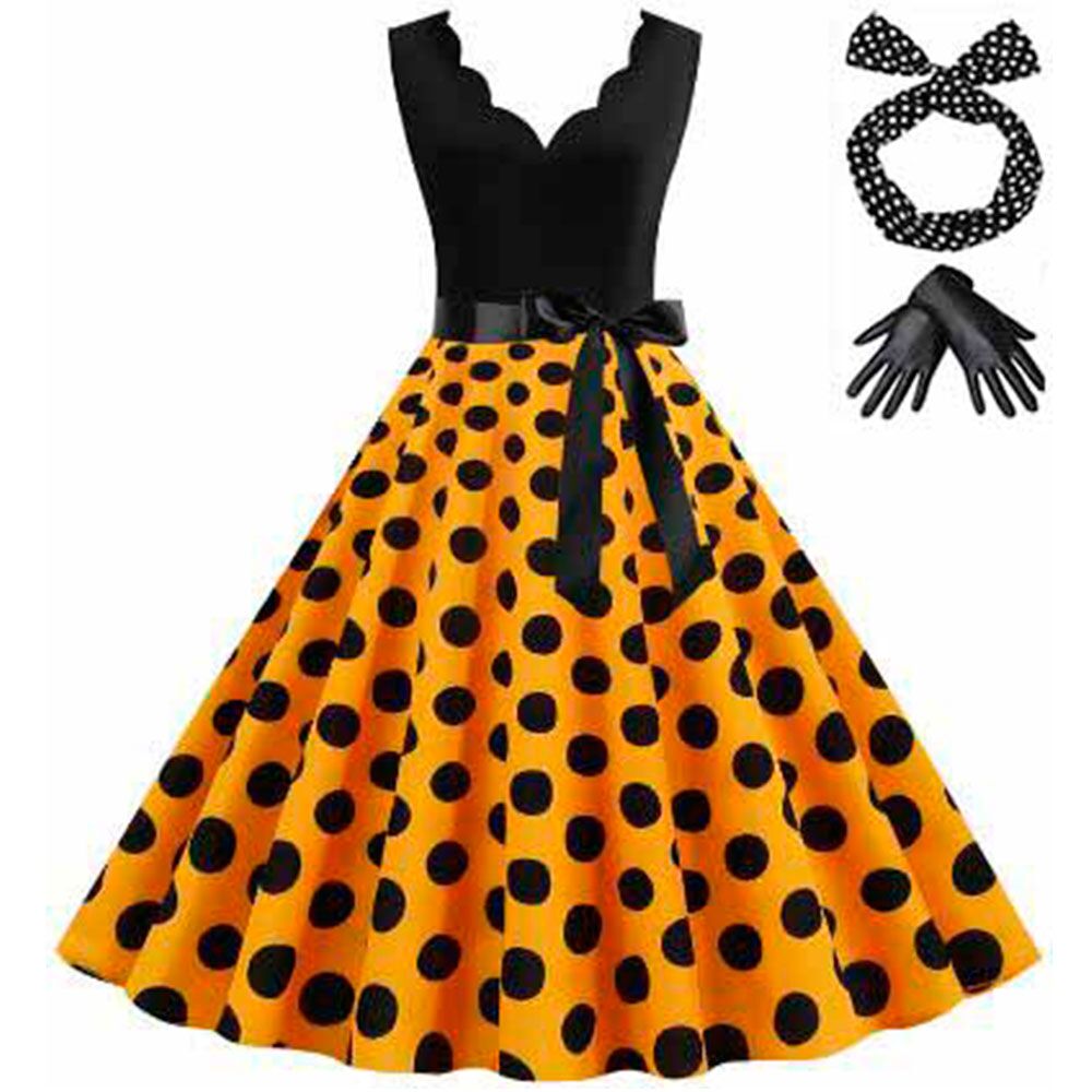 Juego de vestido amarillo con puntos negros con guantes y diadema talla M