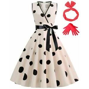 Juego de vestido blanco con lunares negros con guantes y diadema talla L