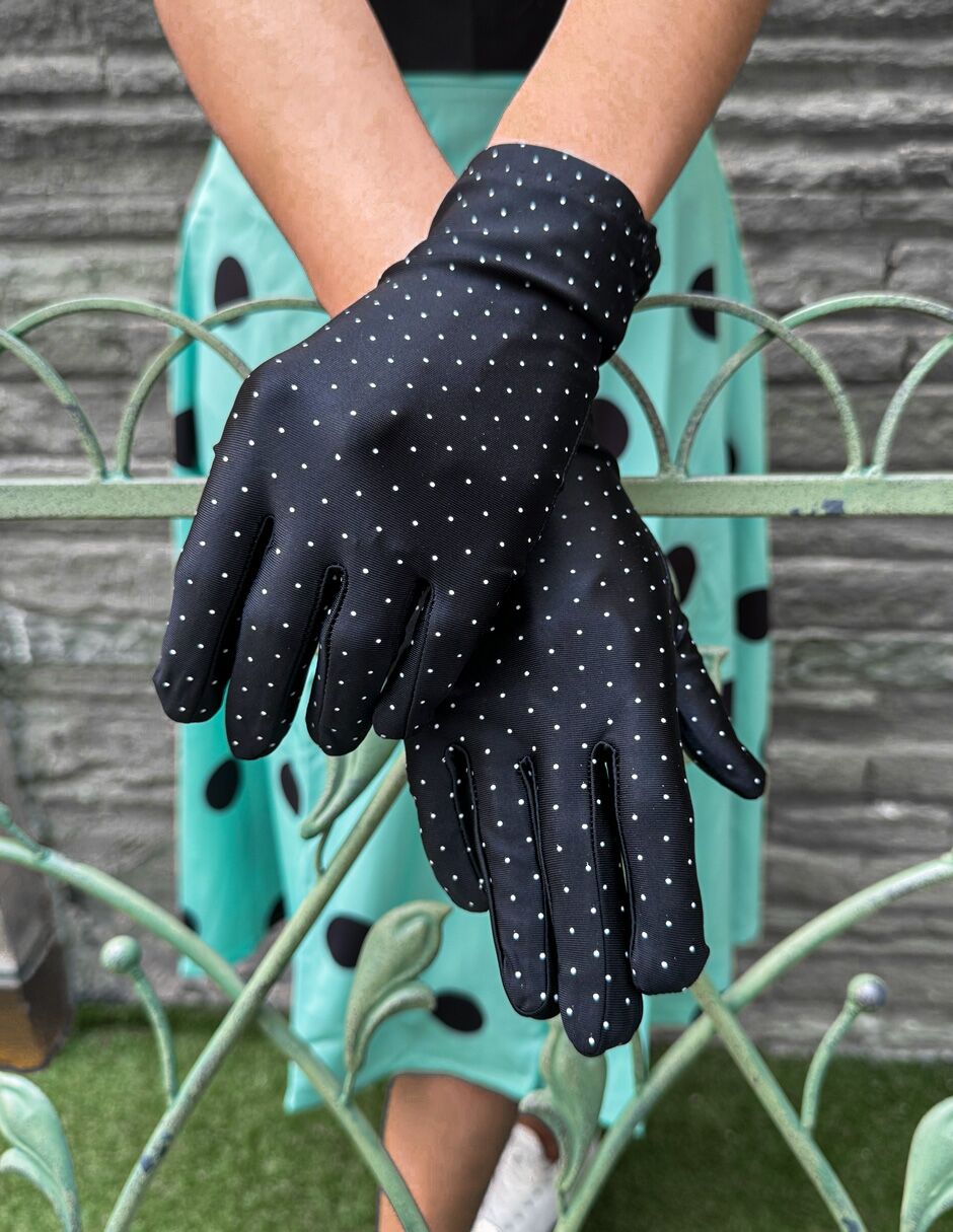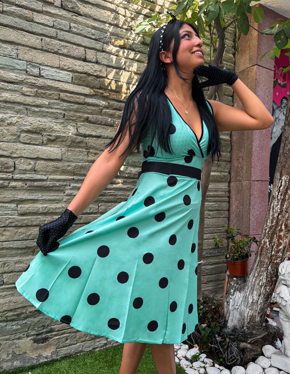 Juego de vestido color menta con puntos negros con guantes y diadema talla S
