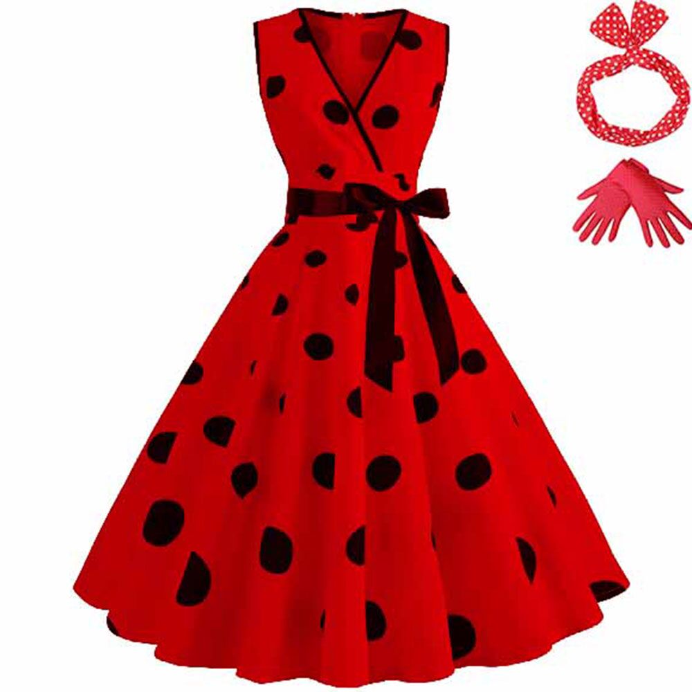 Juego de vestido rojo con puntos negros con guantes y diadema talla S