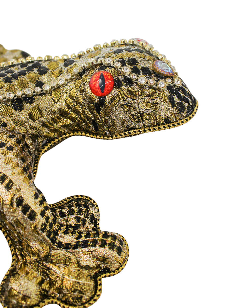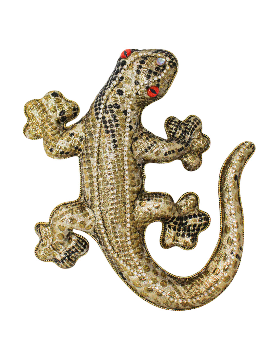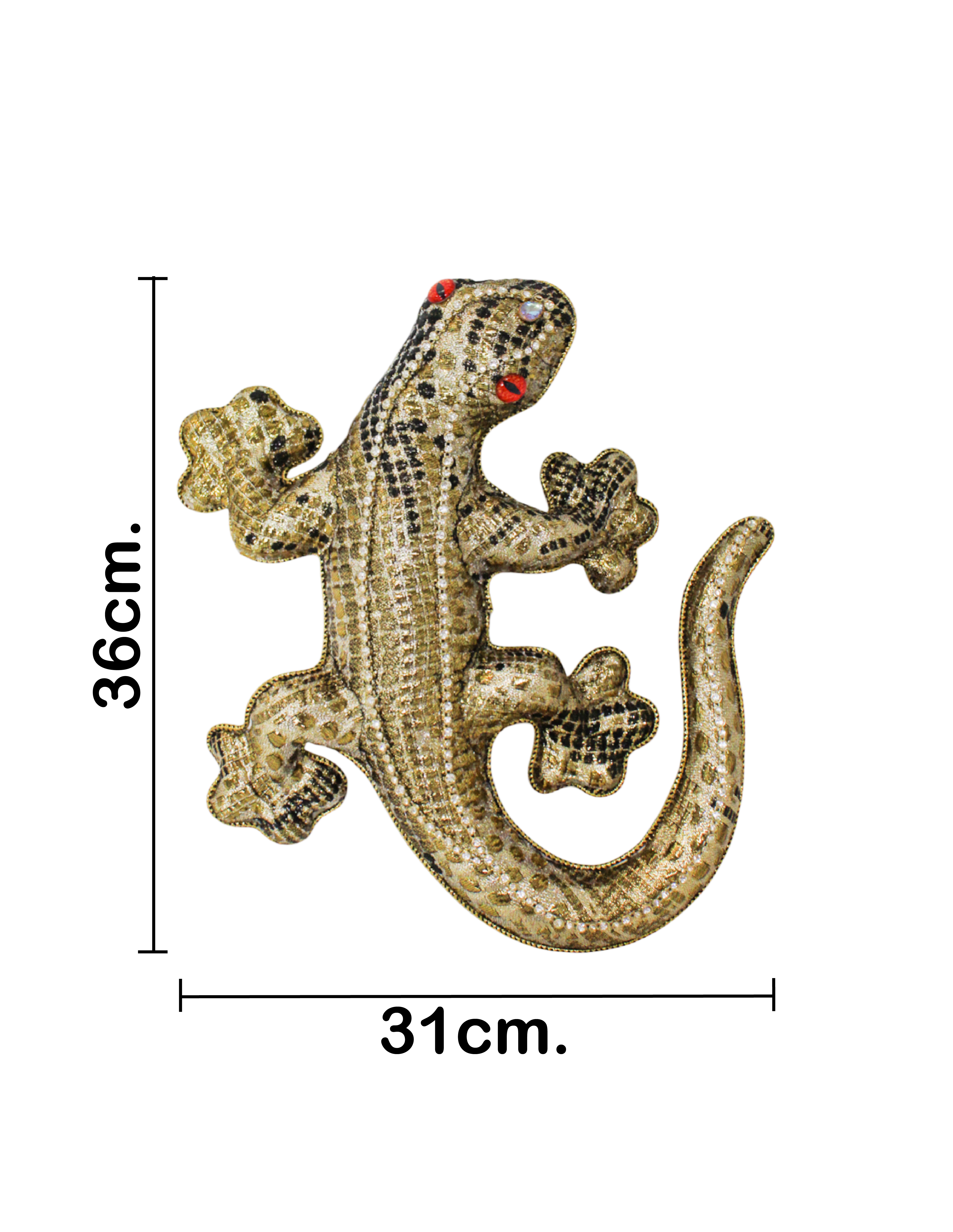 Aporta un toque de misterio a tu hogar con este lagarto dorado. Sus detalles negros te harán sentir la elegancia y la sofisticación. Medidas: 31x35x8 cm.