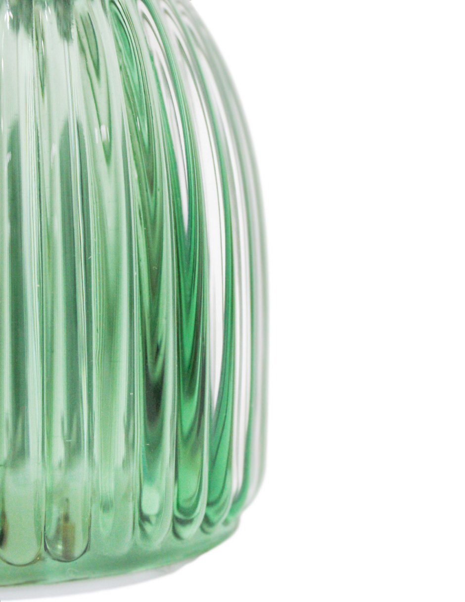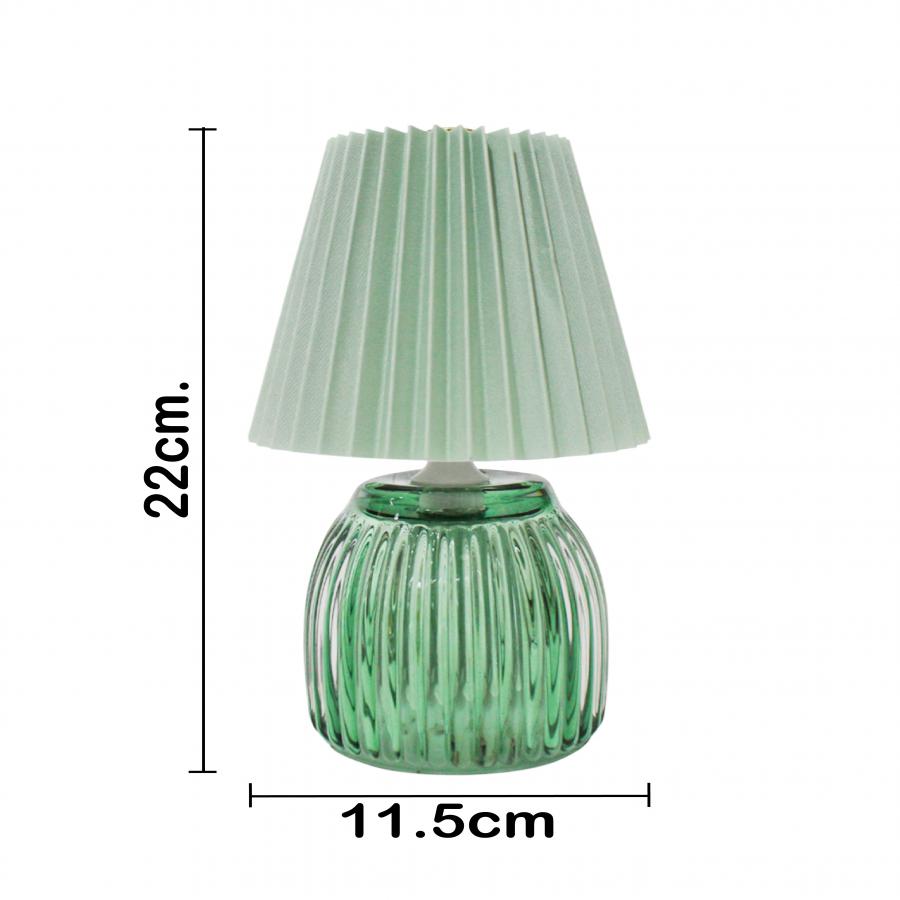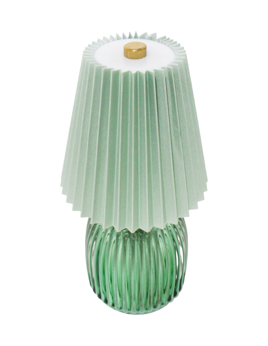 Lámpara con una pantalla verde con un original diseño corrugado. Esta pieza es ideal para quienes buscan una decoración moderna, funcional y llena de estilo. Su diseño único y toque de color evoca una sensación de frescura y tranquilidad, perfecta para crear un ambiente único que ilumine tus noches. Material: plástico y LED.