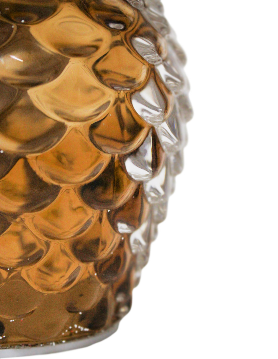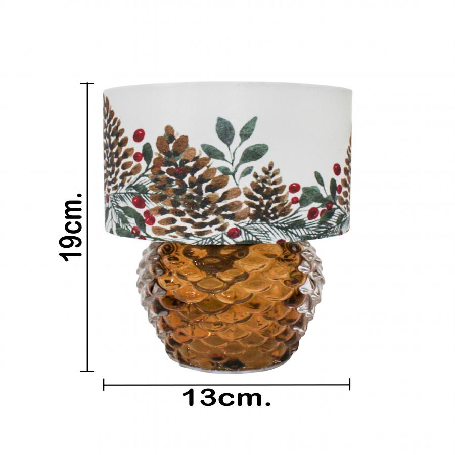 Lámpara café con diseño de escamas y una pantalla con diseño de piñas navideñas. Esta pieza es ideal para quienes buscan una decoración festiva y llena de estilo. Su diseño único y toque de color evoca una sensación de frescura y tranquilidad, perfecta para crear un ambiente único que ilumine tus noches. Material: cerámica y LED.