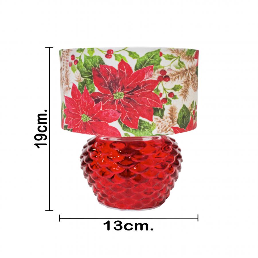 Lámpara roja con diseño de escamas y una pantalla con diseño de nochebuenas. Esta pieza es ideal para quienes buscan una decoración festiva y llena de estilo. Su diseño único y toque de color evoca una sensación de frescura y tranquilidad, perfecta para crear un ambiente único que ilumine tus noches. Material: cerámica y LED.