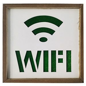 Letrero decorativo y funcional de Wifi que indica la clave con una luz LED verde brillante. Funciona con baterías AAA. Ideal para áreas comunes o para dirigir a los invitados. El material es (Plástico/Acrílico y Componentes electrónicos). Medidas: 20 x 20 cm.