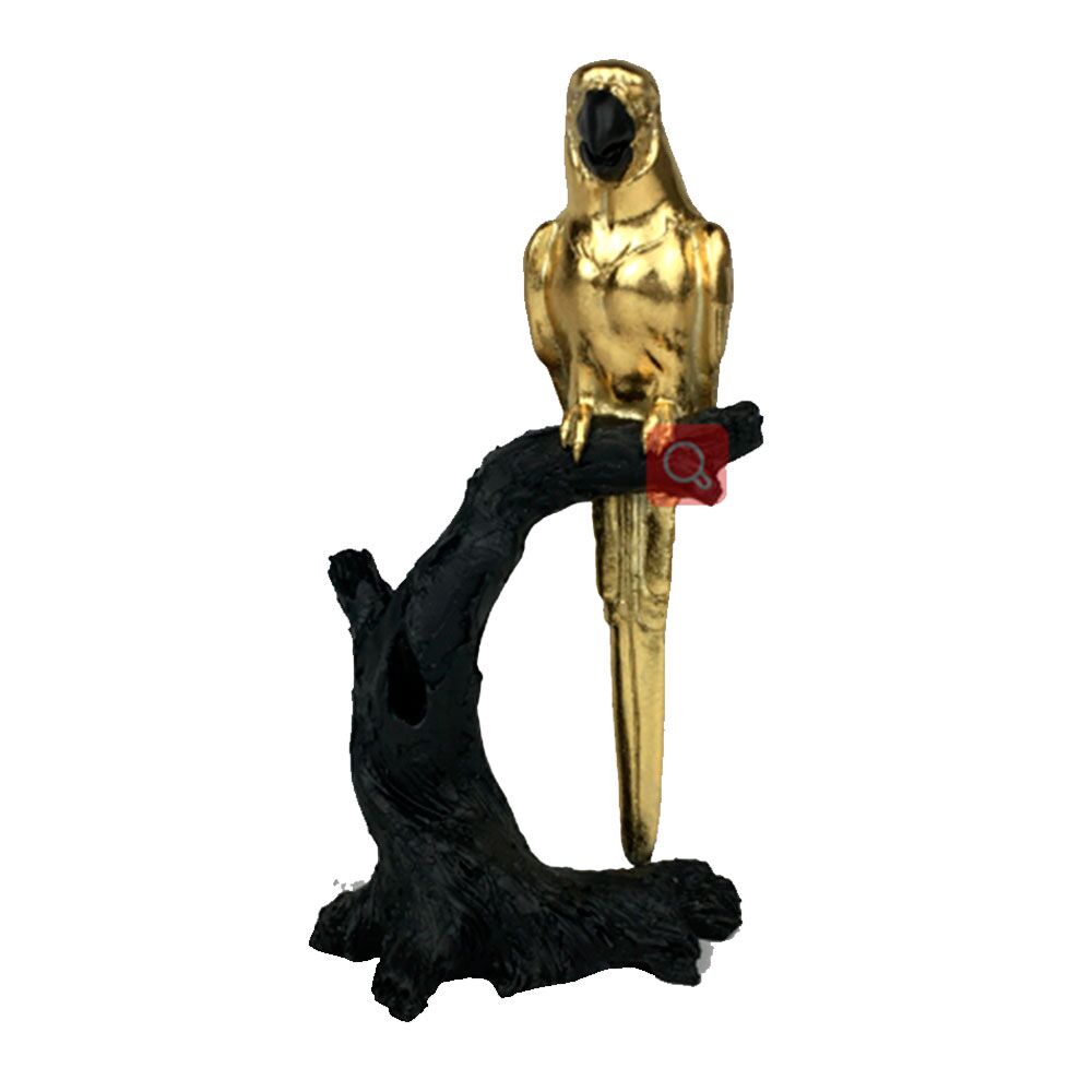 Loro de resina dorado sobre rama de 10.5x7x20.5cm