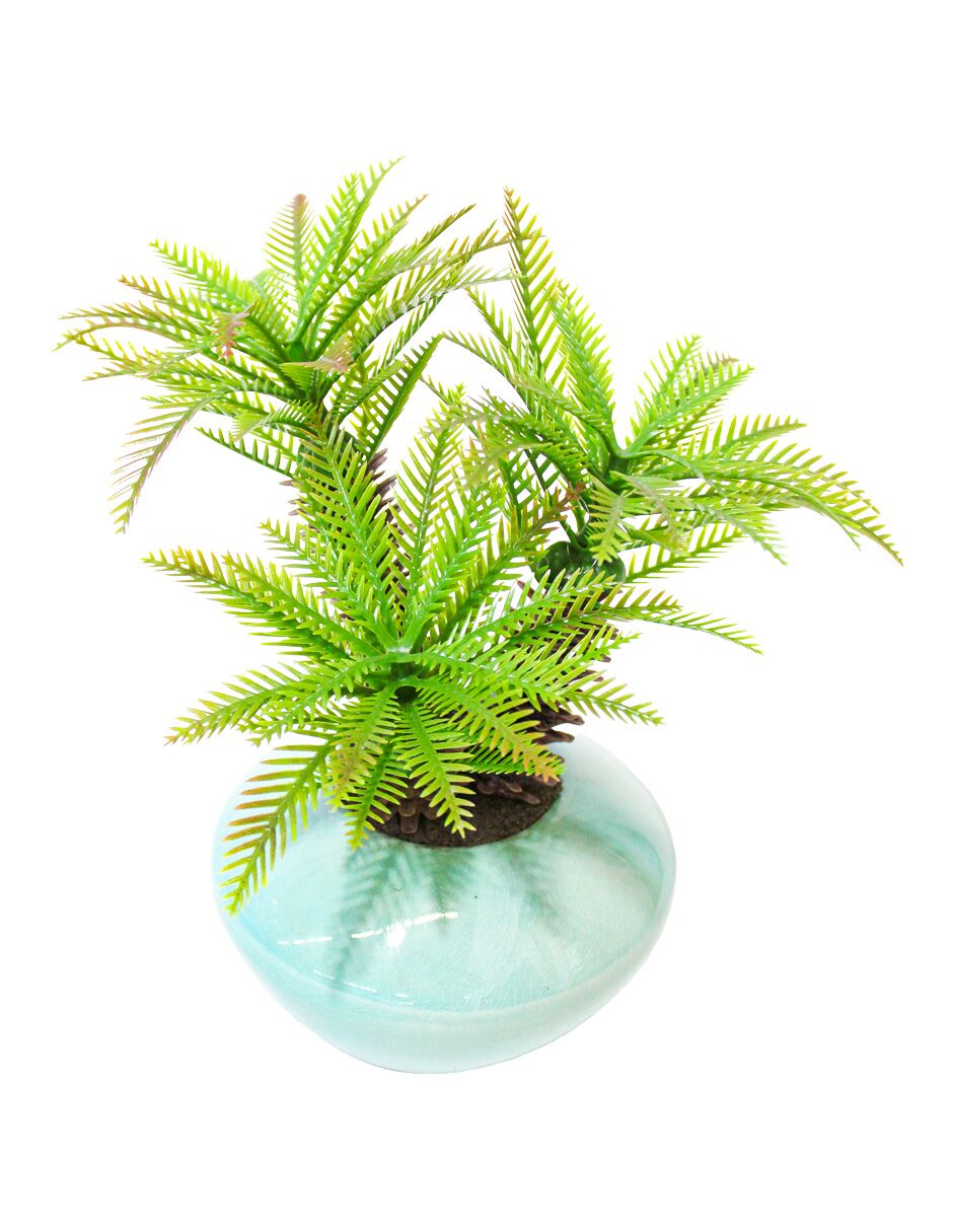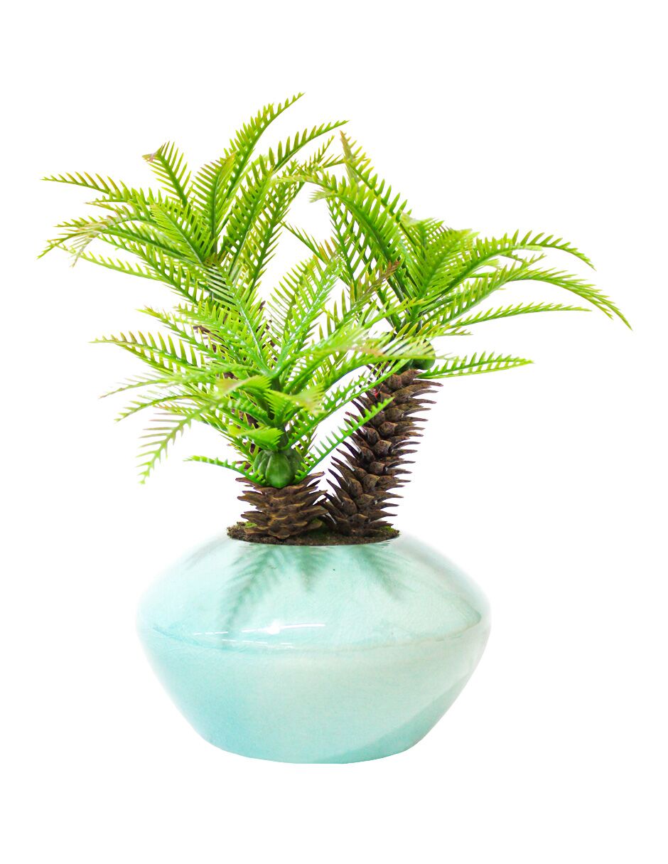 Esta Maceta con flor tipo palmera verde matizada destaca por su alta calidad y su acabado de primera clase. De igual forma, esta pieza juega con la funcionalidad gracias a su tamaño compacto y su base de cerámica esmaltada que garantiza estabilidad, permitiendo un manejo profesional y auténtico de la decoración de interiores. Incluye detalles minuciosos como el relieve realista de la corteza en los tallos y el brillo del esmalte turquesa, lo que maximiza su encanto aristocrático y versatilidad decorativa. Su diseño detallado garantiza una armonía estética perfecta en todo momento hoy mismo. La fabricación con materiales sintéticos premium asegura una durabilidad superior frente al paso del tiempo.