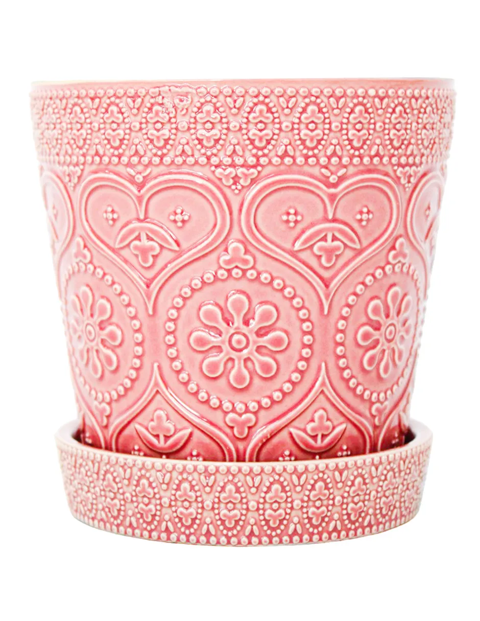 Dale un hogar a tus plantas con un toque de elegancia. Esta maceta de cerámica con plato, diseño grabado en color rosa, es perfecta para embellecer tu espacio. Su diseño te hará sentir la calma y la tranquilidad que tu hogar necesita. Mide 13x13x12cm.