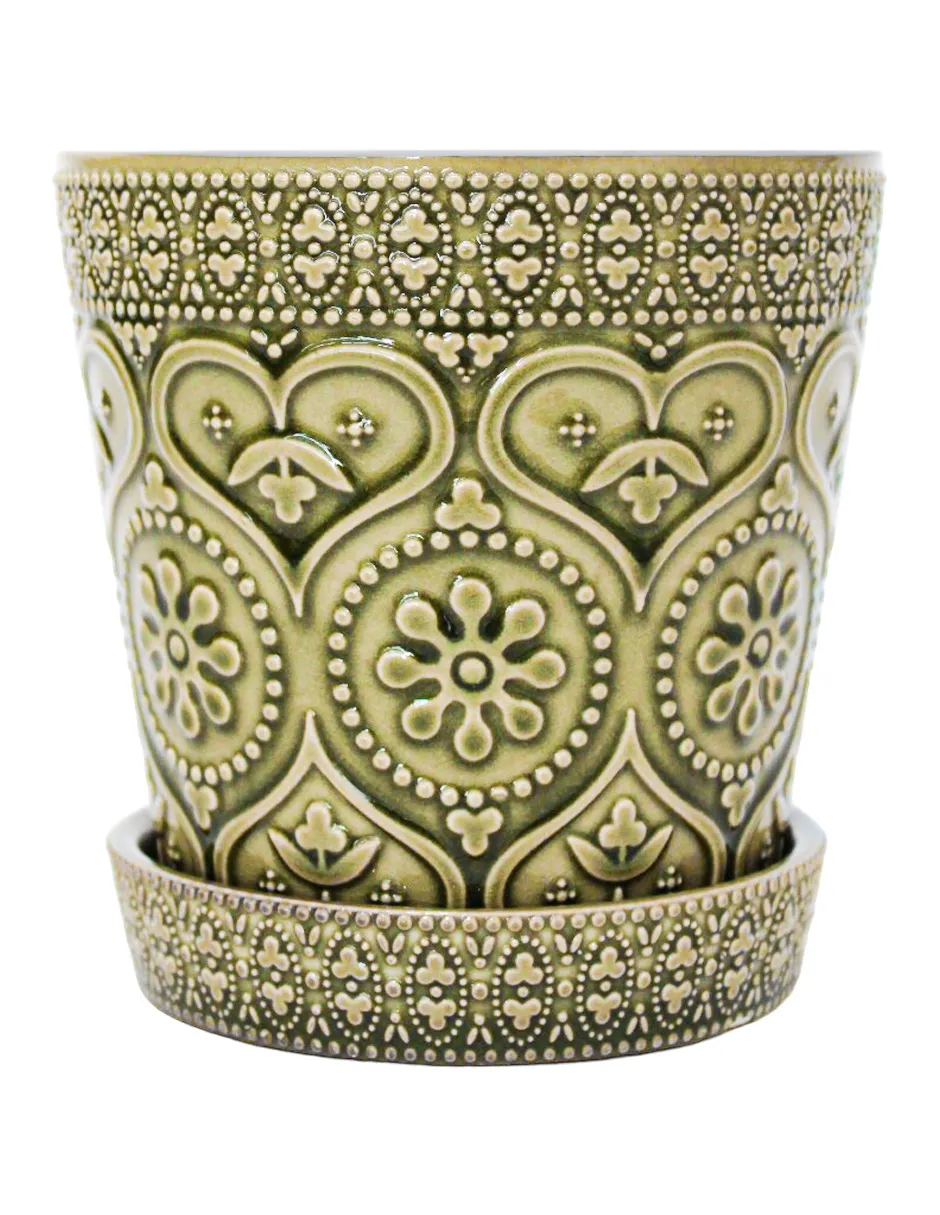Dale un hogar a tus plantas con un toque de elegancia. Esta maceta de cerámica con plato, diseño grabado en color verde, es perfecta para embellecer tu espacio. Su diseño te hará sentir la calma y la tranquilidad que tu hogar necesita. Mide 13x13x12cm.