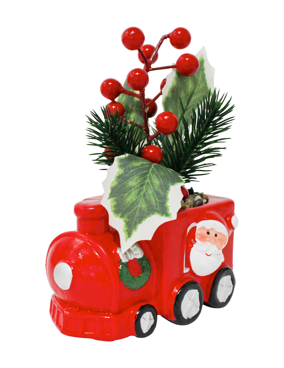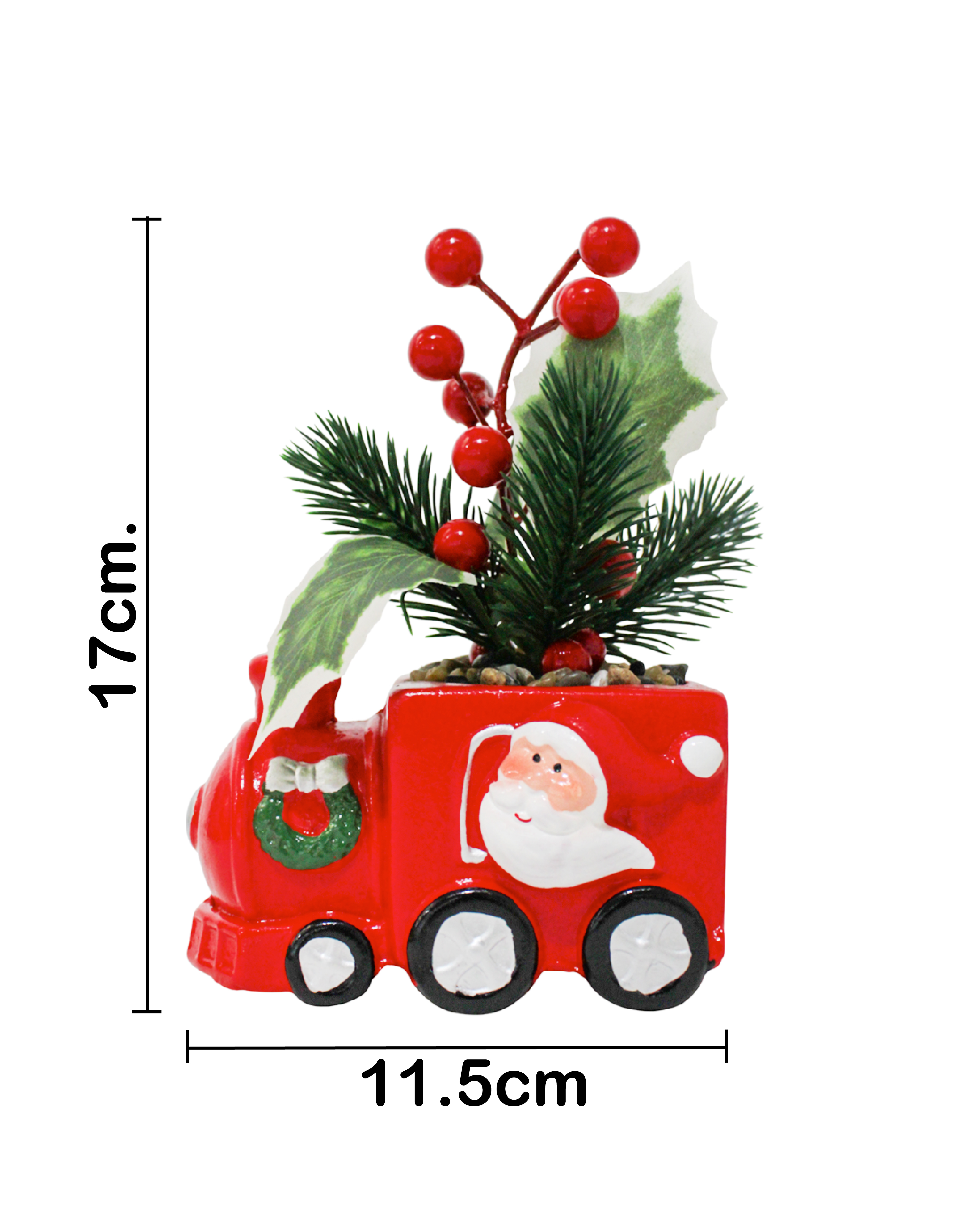 Una adorable maceta con un diseño de locomotora, con un Santa y un árbol de berries rojos de 11.6×8.8x20cm. Fabricada en cerámica, esta pieza es ideal para decorar tu hogar en la temporada navideña. Perfecta para pequeñas plantas o como un accesorio festivo en cualquier rincón.