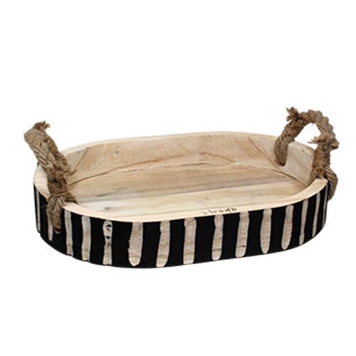 Maceta ovalada fabricada en madera natural con detalles en negro y agarraderas. Medidas: madera natural intercalado negro y agarraderas. Su diseño artesanal aporta estilo rústico y funcionalidad decorativa.