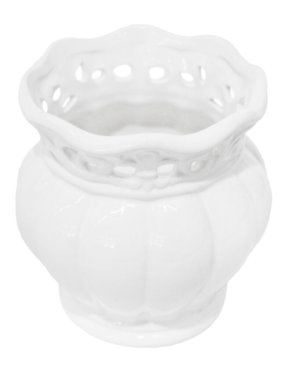Dale un toque de sofisticación a tus plantas. Esta maceta redonda de porcelana blanca con un delicado grabado es ideal para realzar la belleza de tus plantas. Su diseño minimalista y elegante te hará sentir la pureza y la tranquilidad. Mide 13x13x13cm.