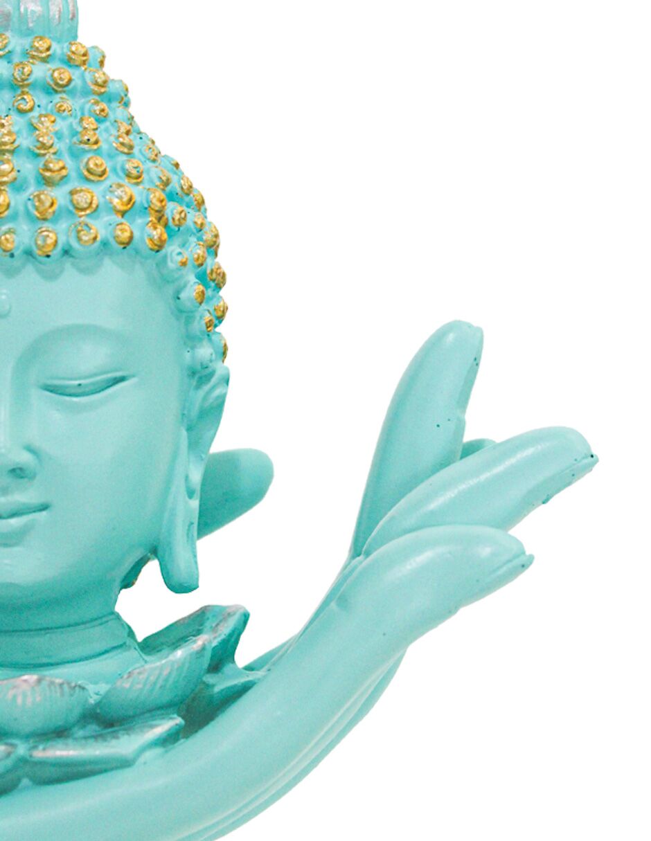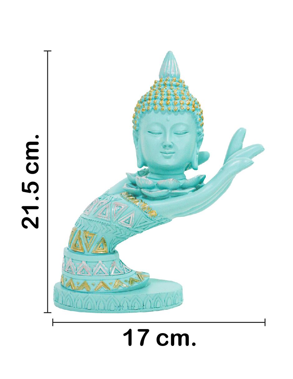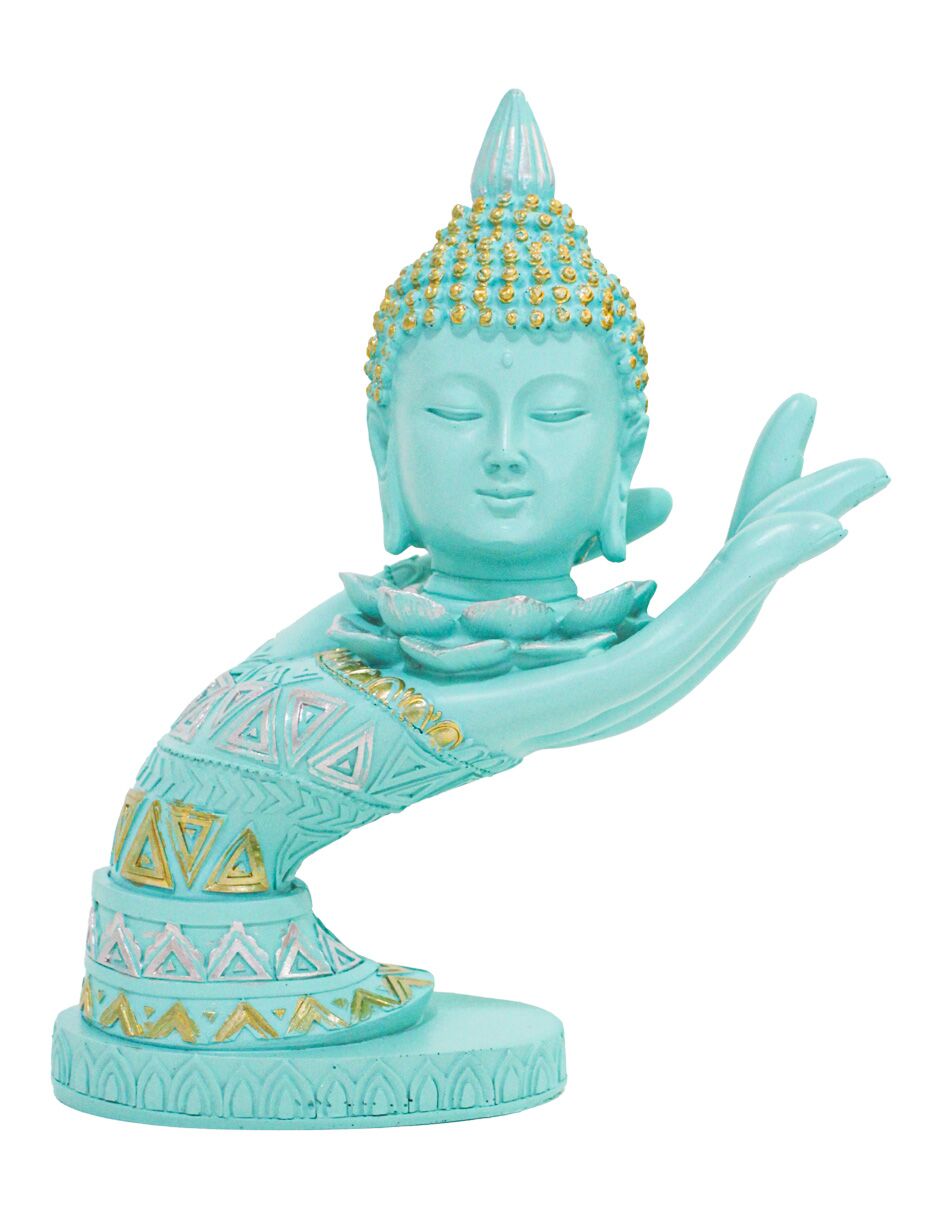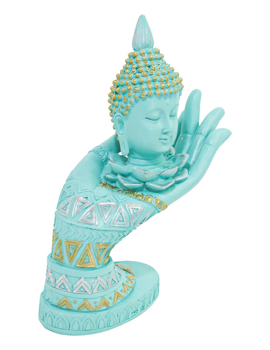 Mano derecha con cabeza de buda de poliresina azul turquesa de 21.5cm.