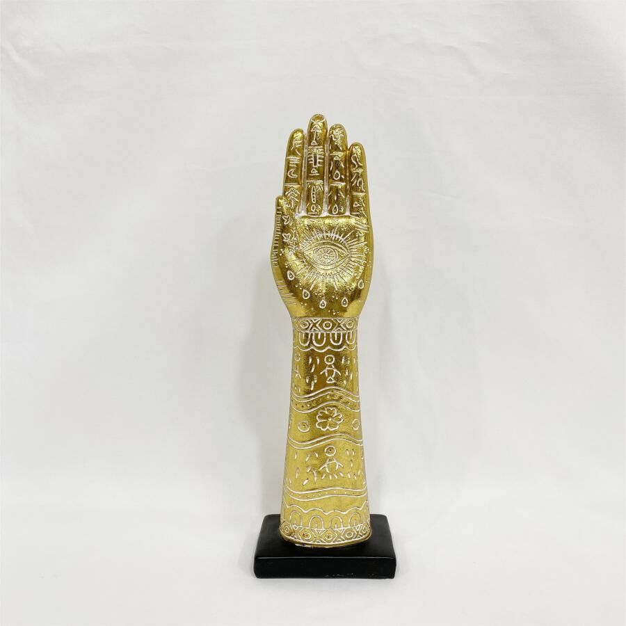 Inyecta un misticismo ancestral y un lujo protector a tu espacio con esta cautivadora escultura. Su diseño en poliresina combina la simbología poderosa del Ojo de Horus (protección, salud y regeneración) con la forma orgánica de una palma de la mano, creando una pieza de máxima distinción y energía espiritual. Es el acento perfecto para infundir sabiduría, sofisticación cultural y un toque místico a cualquier repisa o escritorio. Material: Poliresina. Medidas: 7 x 5 x 25.5 cm.