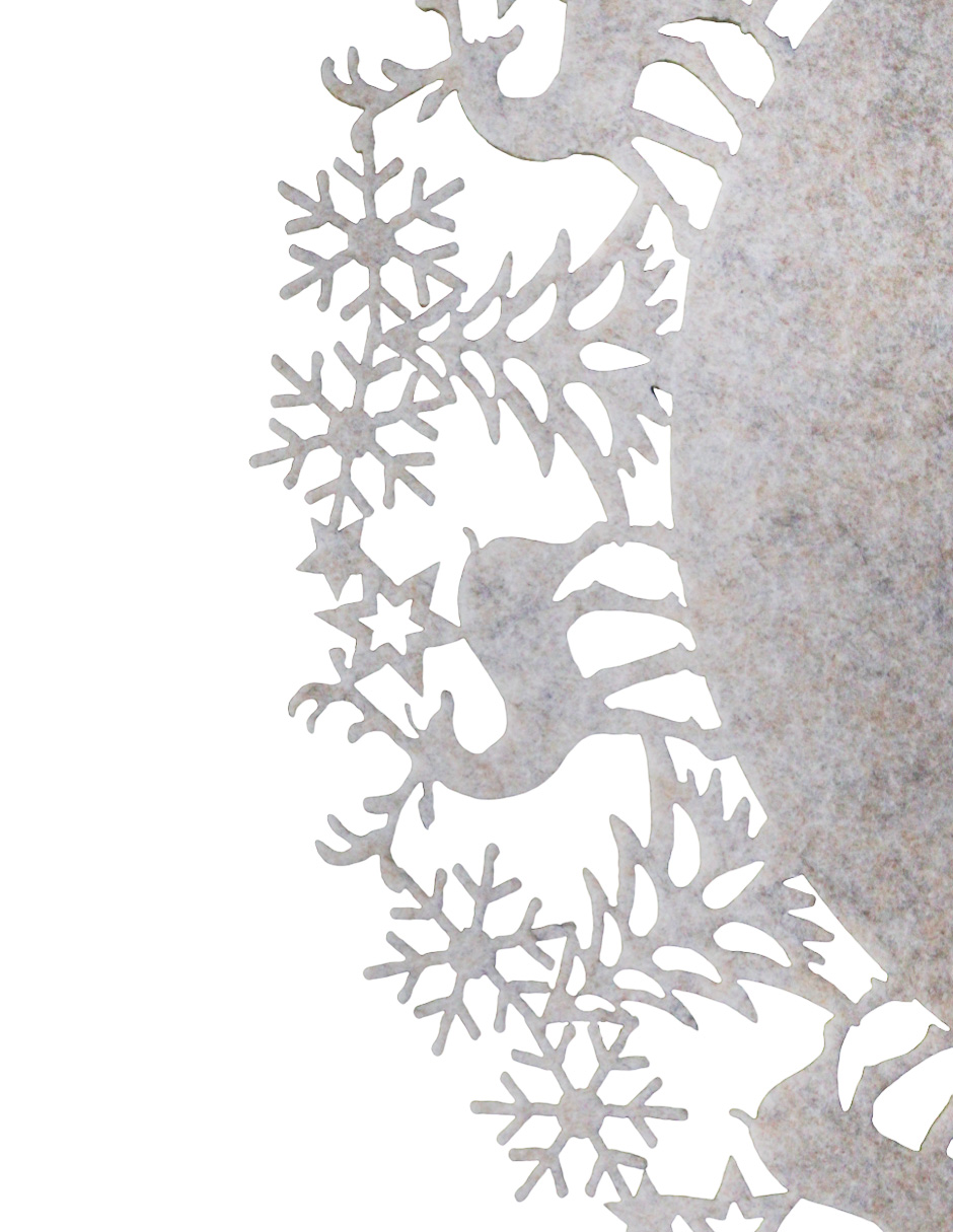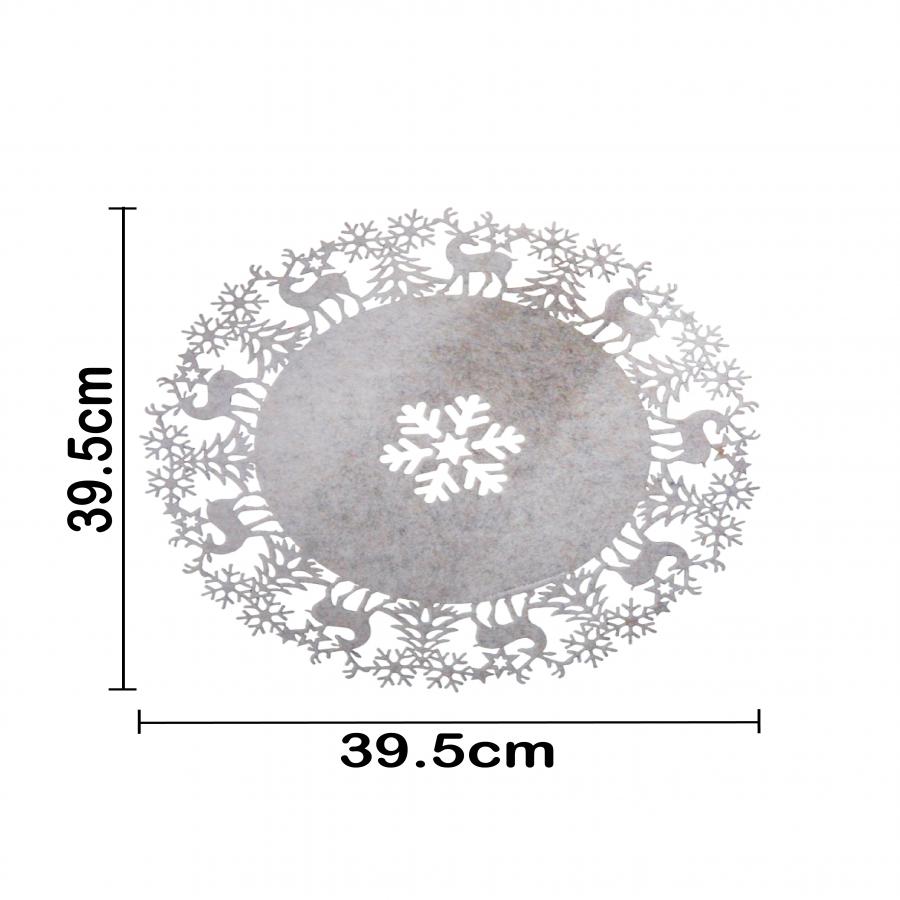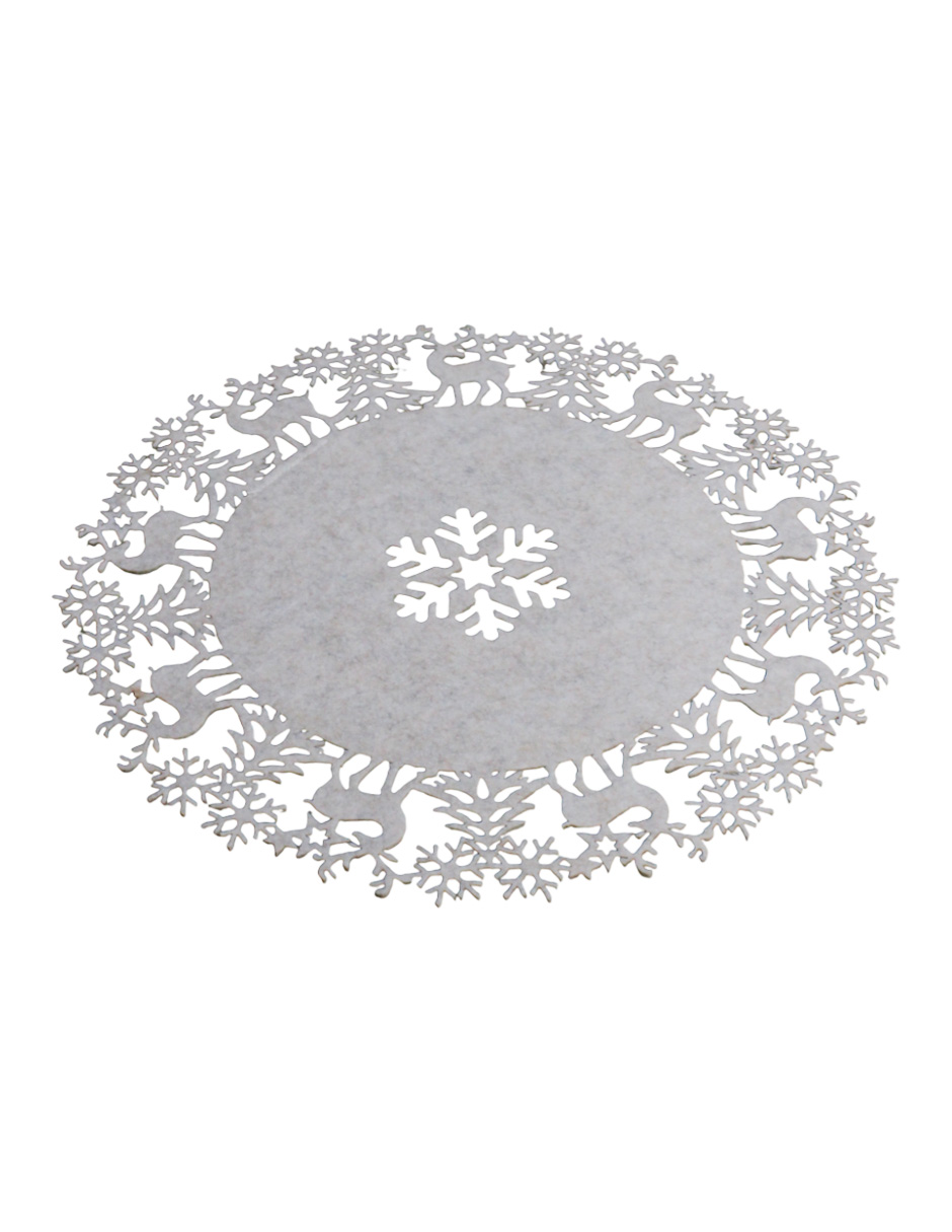 Un delicado mantel de fieltro beige con ciervos y copos navideños, con medidas de 40x40x0.3 cm. Ideal para un toque de calidez y elegancia.