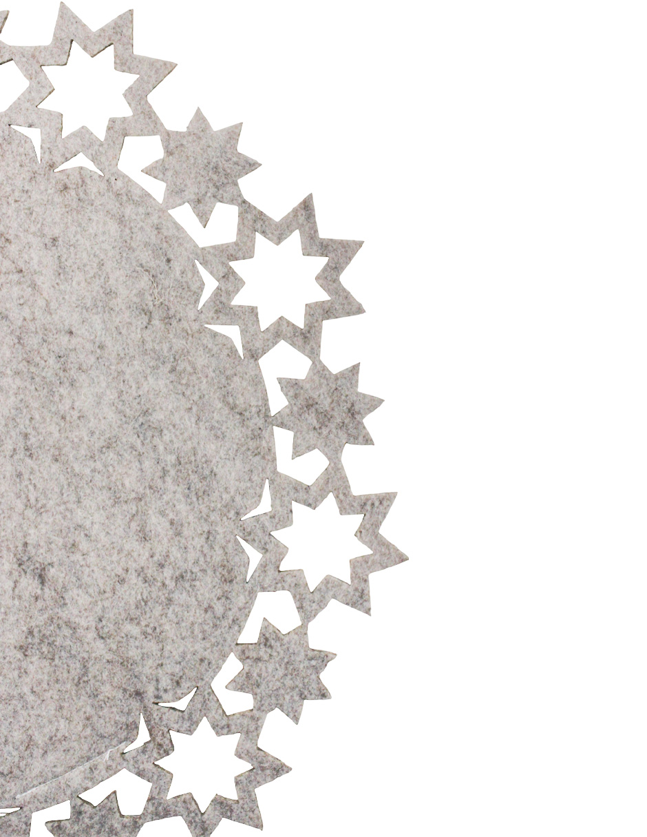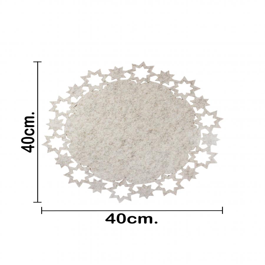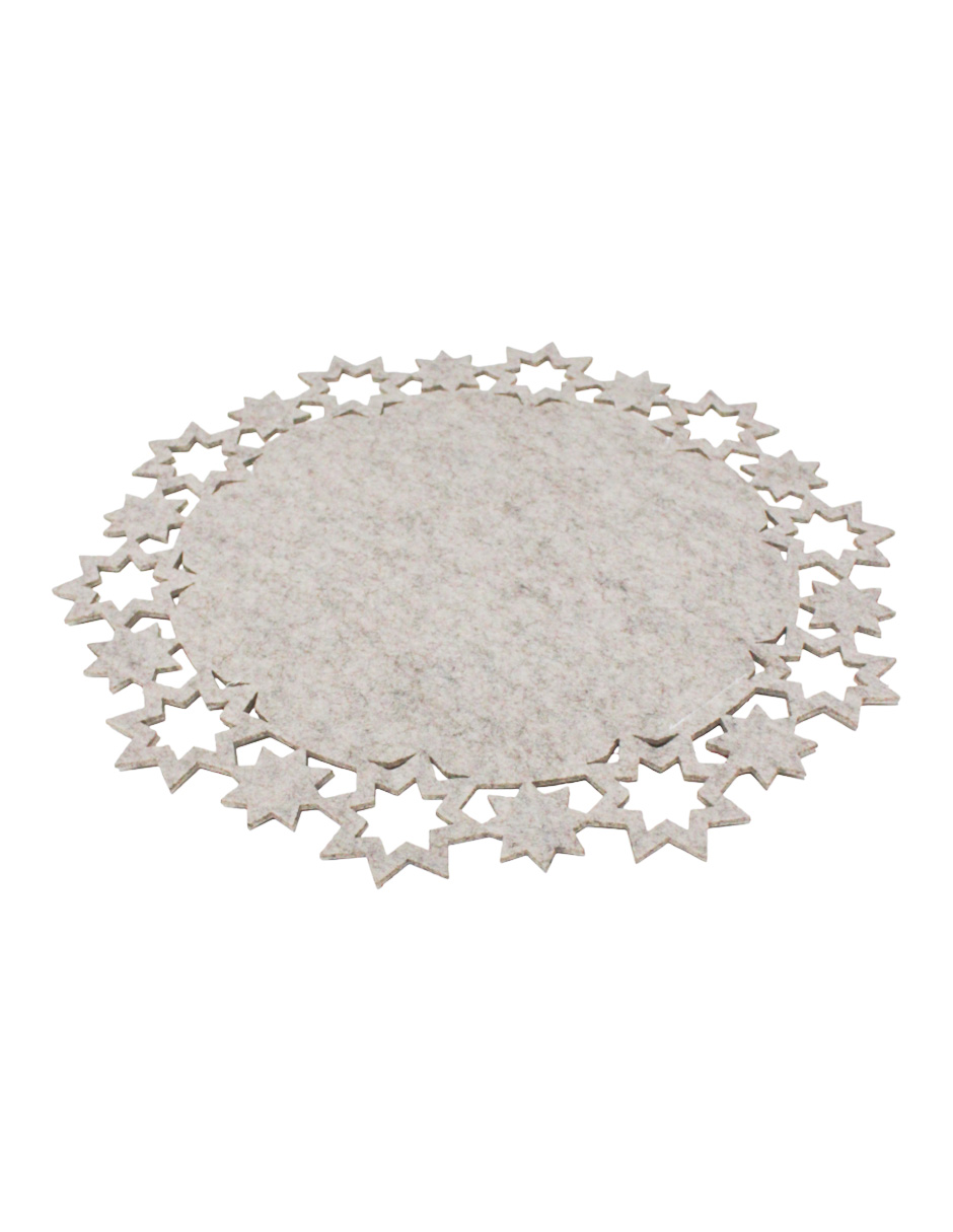 Un delicado mantel de fieltro beige con una orilla de estrellas, con medidas de 40x40x0.3 cm. Ideal para proteger tus superficies con un toque de calidez y elegancia.