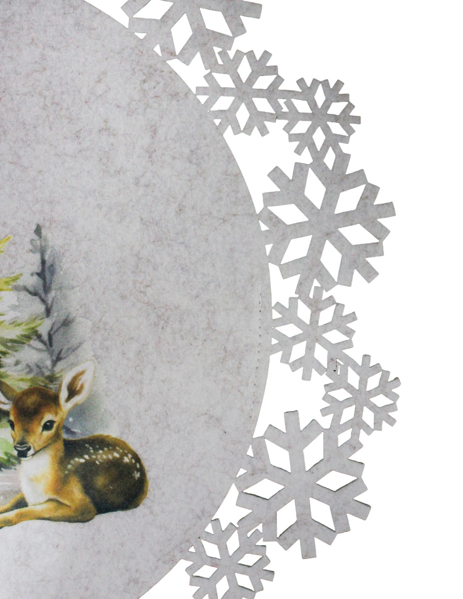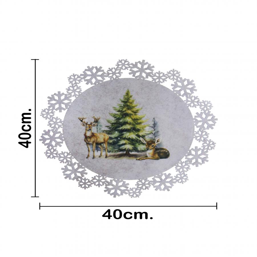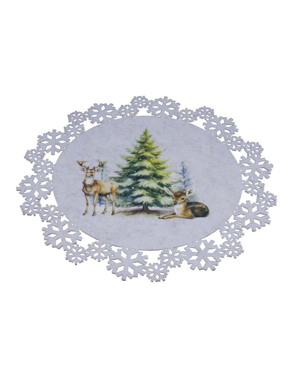 Un rústico mantel beige con un estampado de ciervos con pino, con medidas de 40x40x0.3 cm. Ideal para un toque de naturaleza y encanto.
