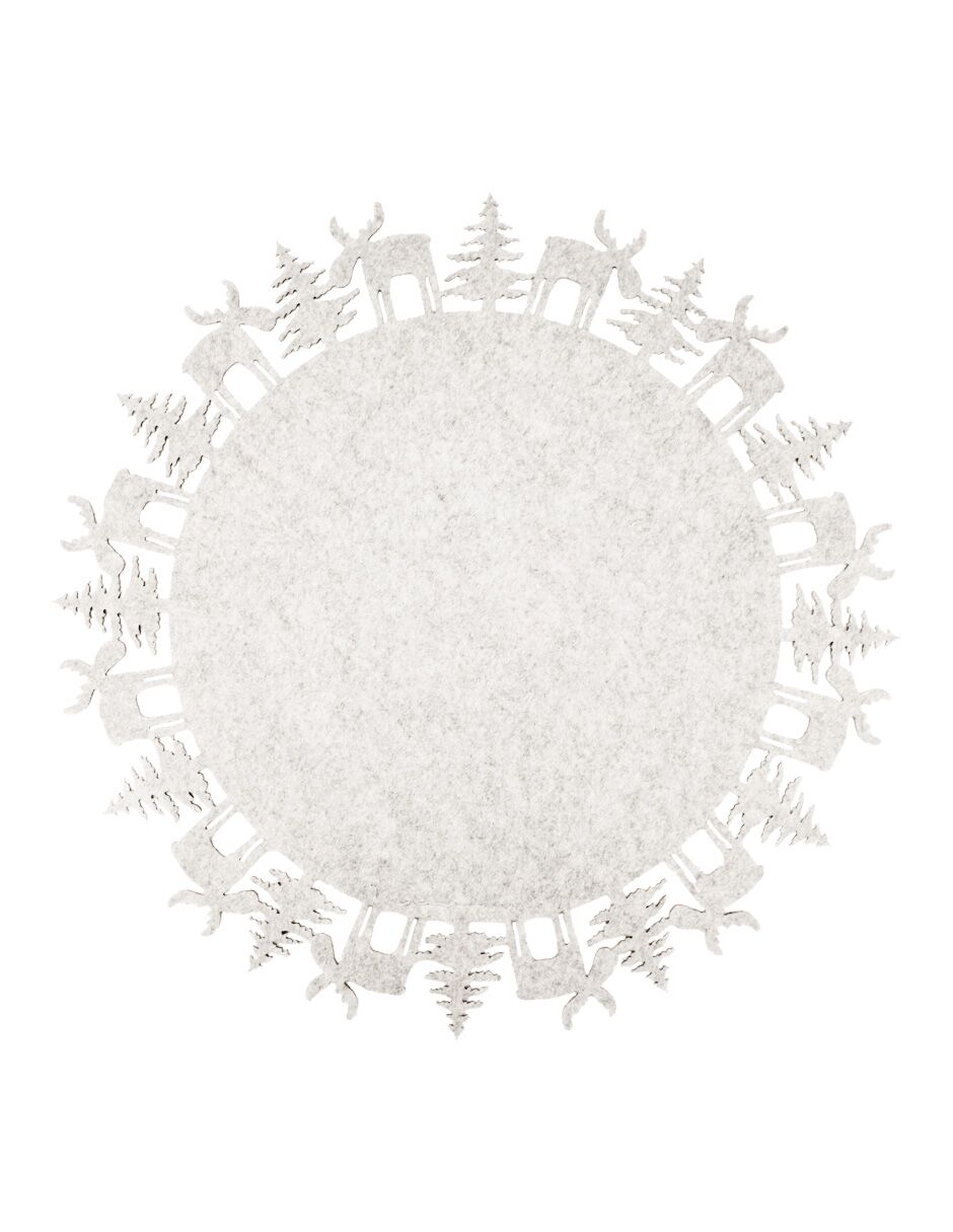 Un festivo mantel de fieltro blanco con una orilla de renos y pinos, con un diámetro de 35 cm. Ideal para proteger tus superficies con un toque de pureza y magia.