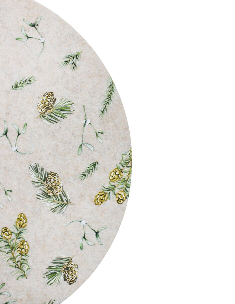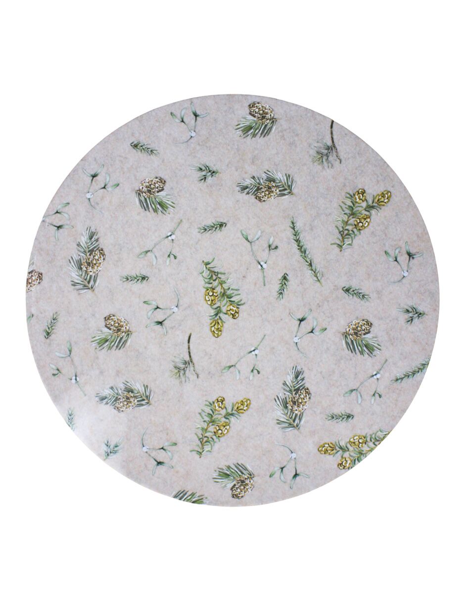 Un rústico mantel de fieltro con un estampado de follaje verde y piñas navideñas, con medidas de 40x40x0.3 cm. Ideal para proteger tus superficies con un toque de naturaleza y calidez.