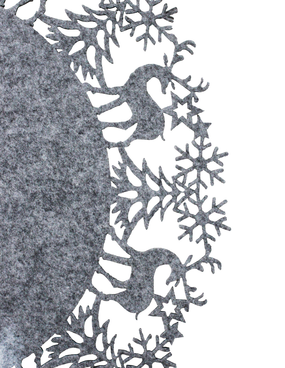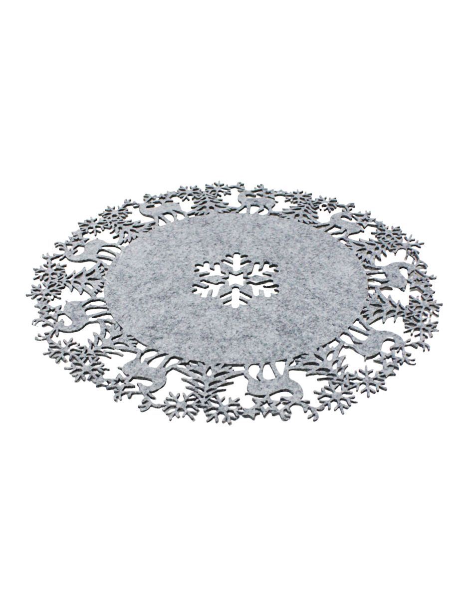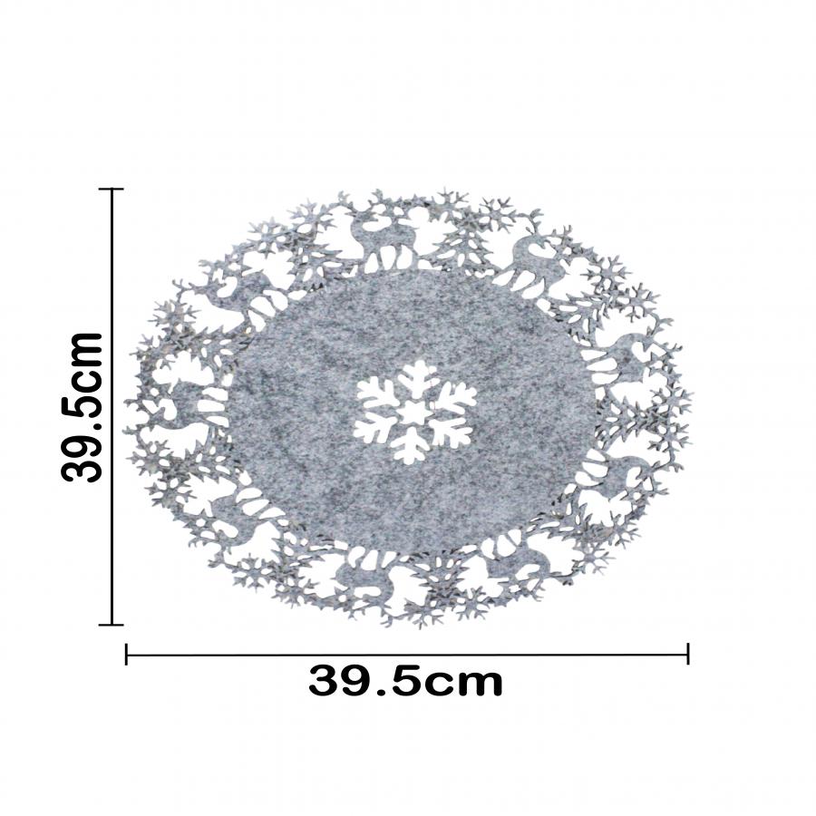 Un moderno mantel de fieltro gris con ciervos y copos navideños, con medidas de 40x40x0.3 cm. Ideal para un toque de estilo y sofisticación.