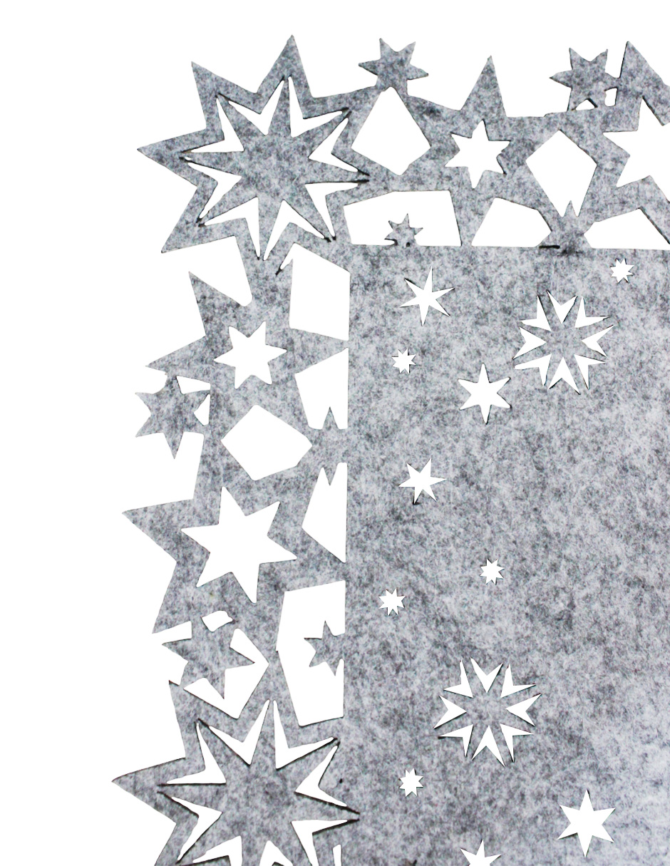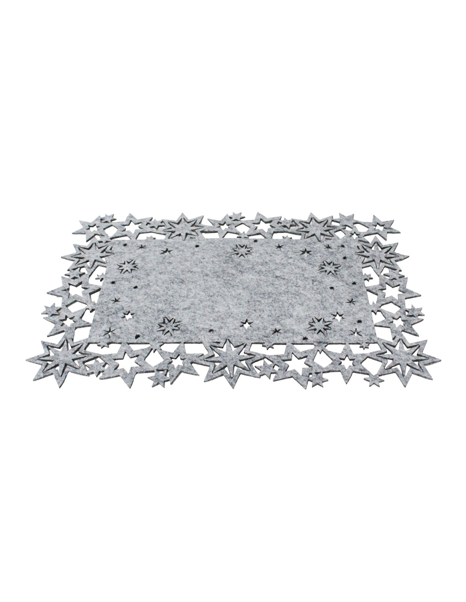 Un moderno mantel de fieltro gris con un diseño de estrellas, con medidas de 45x33x0.3 cm. Ideal para proteger tus superficies con un toque de estilo y sofisticación.