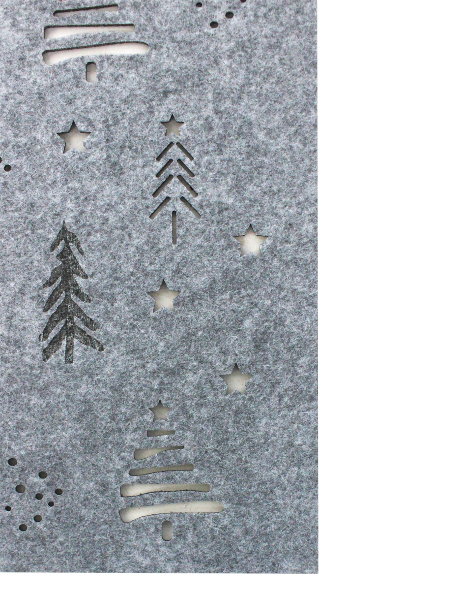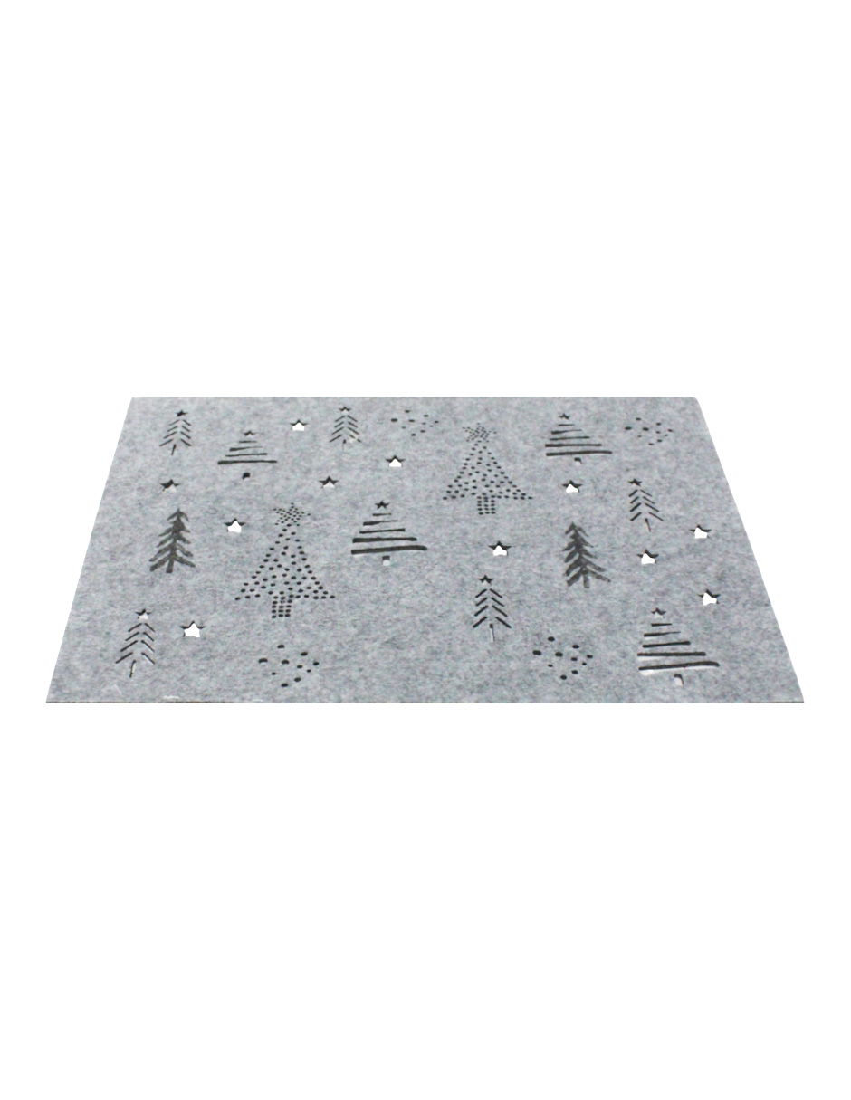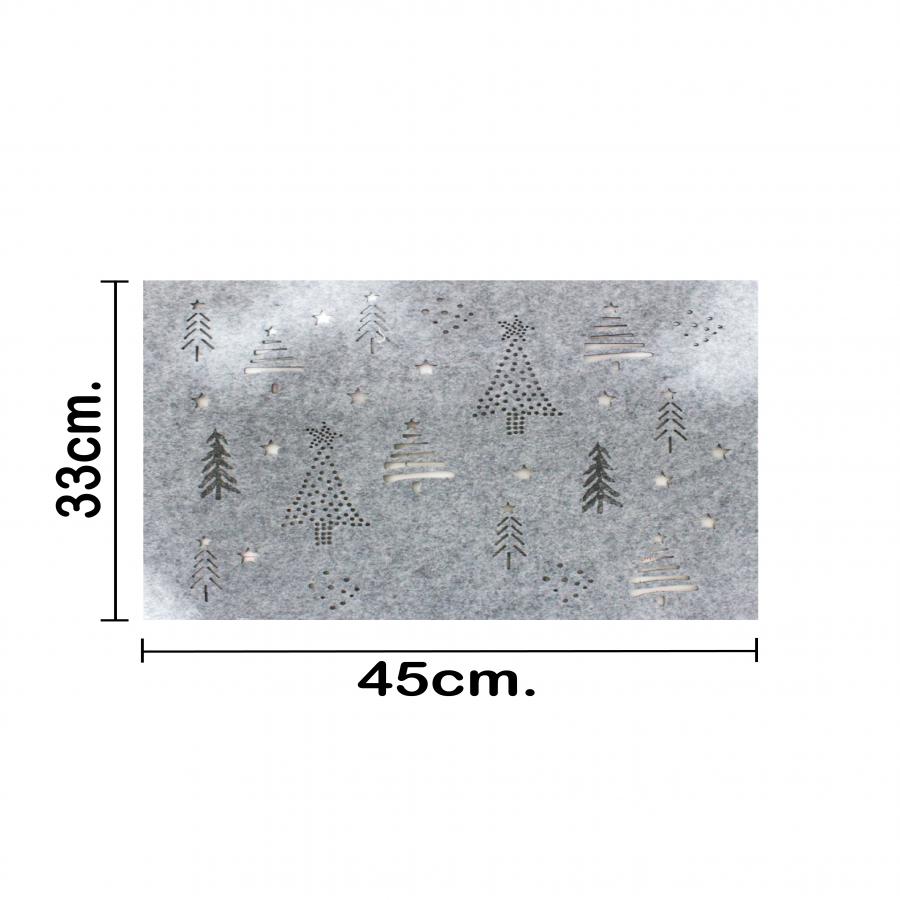 Un moderno mantel de fieltro gris con un estampado de árboles navideños, con medidas de 45x33x0.3 cm. Ideal para proteger tus superficies con un toque de estilo y sofisticación.