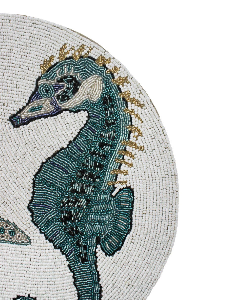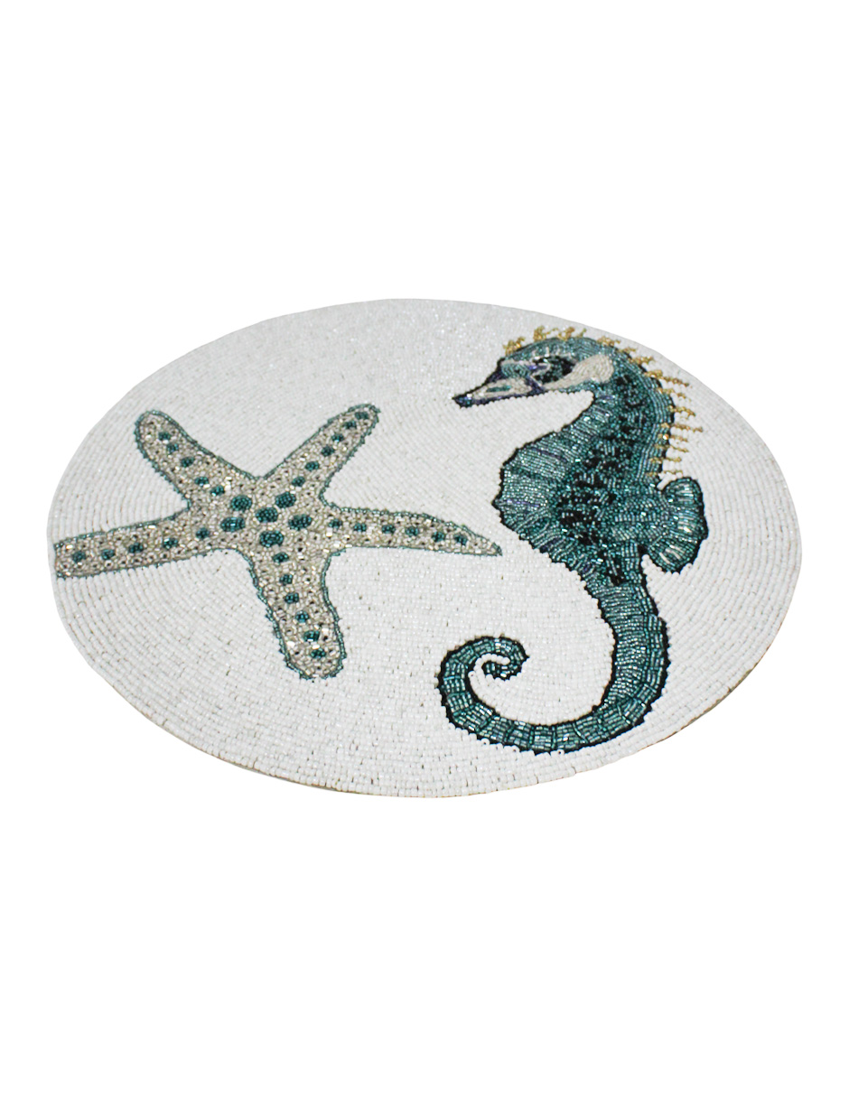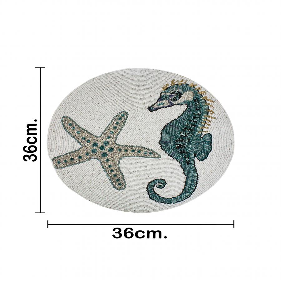 El Mantel Individual Caballito Estrella Mar Chaquiras irradia encanto marino y lujo costero. Este Mantel Individual Caballito Estrella Mar Chaquiras no solo es un tapete, sino una pieza que infunde una atmósfera de ensueño y sofisticación náutica en tu mesa. Siente la exclusividad del trabajo hecho a mano, pues el mosaico de Chaquiras dibuja la icónica pareja de Caballito de Mar y Estrella de Mar con gran detalle y brillo.